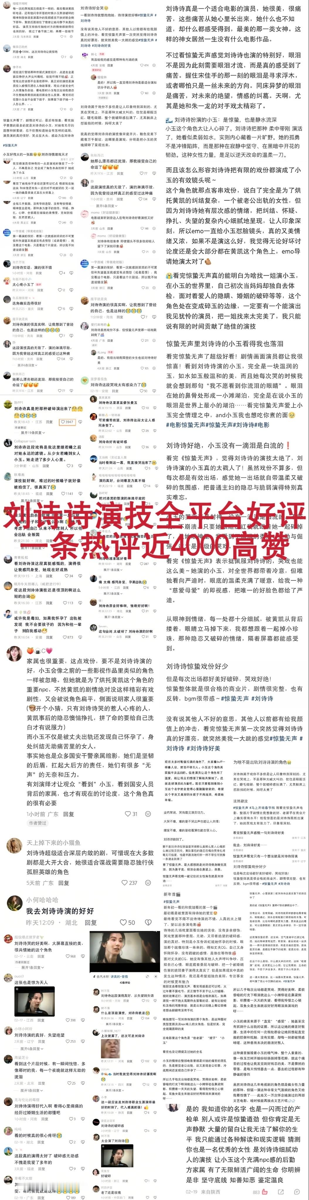 惊蛰无声网络评价和现实评价 刘诗诗饰演小玉一角,演技获全平台好评,只要是惊蛰无声小玉的视频几乎条条破万,最高一条破10万,夸刘诗诗的评论也高达18W➕👍。