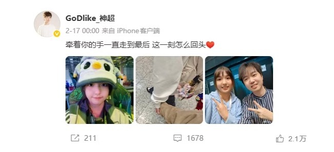 神超晒照官宣恋情,配文:牵着你的手一直走到最后,这一刻怎么回头。云顶之弈圈的主播好友都来送上祝福。