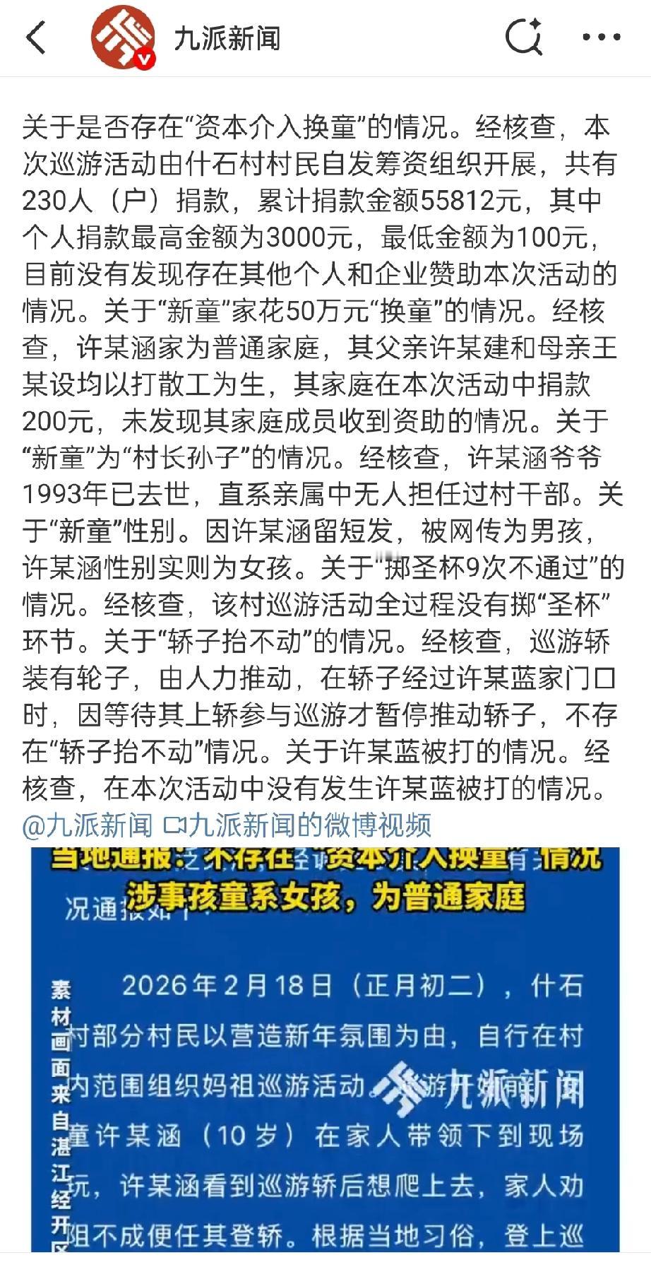 官方通报网传妈祖巡游换童事件。 万万没想到,湛江妈祖换人事件,居然还有官方通报。 2月22日晚,官方发布通报,辟谣了网传的诸多说法。 比如,耀祖换女,又比如,9次掷圣杯不过,又比如,资本介入换童。 通报称,女童只是看到巡游轿后,觉得好玩就爬了上去,其家境也相对普通。 另外,掷圣杯9次不通过,轿子抬不动,女童被打等传闻,均属谣言。[吃瓜群众][吃瓜群众][吃瓜群众]妈祖巡游 妈祖升天纪念日 升天妈祖