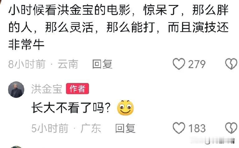 大家别再羡慕洪金宝了! 我们永远也成不了他!原因很简单,有个条件我们根本达不到,那就是,这个人把倔强刻到骨子里了! 2月23日,洪金宝在社交平台发了条视频,剪的全是自己年轻时拍武侠片的名场面。镜头里的他一身敦实身形,却能在银幕上辗转腾挪,拳拳到肉的打戏看得人酣畅淋漓,连眼神里都是戏,妥妥是刻在我们这代人童年里的光影记忆。 视频发出来没多久,评论区就炸了,全是网友的怀旧感慨。有个网友留了句特别真诚的话,说小时候看他的电影直接看呆了,怎么会有这么胖的人,身手这么灵活,打戏这么厉害,连演技都这么牛。 结果谁都没料到,洪金宝居然亲自翻了这条评论,回了一句:“长大不看了吗?”末尾还配了个微笑表情。 就这短短六个字,直接把全网都整破防了。 有人说他是不高兴了,可明眼人都看得出来,这哪里是生气,分明是这个在江湖里叱咤了一辈子的大哥,藏在硬壳里的一点小在意,他在意自己的作品是不是还被观众记着,在意小时候看他电影的那群人,长大了是不是就不看了。 评论区瞬间就被温柔填满了。有网友笑着调侃“大哥这哪里是质问,分明是撒娇啊!谁能想到打遍港圈的大哥大,私下里居然是个求关注的小朋友”;也有人看得鼻酸,说“这才是真正把观众放在心上的演员,一辈子拿遍了大奖,捧红了半个武行,到了这个年纪,最在意的还是有没有人看他的戏”;更多看着他电影长大的观众,齐刷刷在评论区留言“大哥的戏,我们从小看到大,一辈子都在看”。 其实也难怪他会这么在意。 洪金宝这三个字,就是香港武打电影的半壁江山。从十几岁扎进武行开始,他一辈子都在跟镜头、跟拳脚打交道。早年间为了拍最真实的效果,他从来不用替身,高空跳楼、近身肉搏,全是实打实来,一身的江湖地位,全是拿命拼出来的,也落下了一辈子的伤病,尤其是腿上的旧伤,缠了他几十年。 这些年我们很少在大银幕上看到他了。不是他不想拍,是伤病实在不允许。前些年他腿伤最严重的时候,连正常走路都费劲,可就算是这样,偶尔接了戏份,他也从来不肯糊弄半分,咬着牙强撑,也要把每一个动作、每一个镜头拍到位,不辜负每一个买票进场的观众。 好在今年老爷子状态好了不少,又开始拍起了功夫视频。镜头里的他,头发白了,身形比年轻时更胖了,可抬手投足间的利落劲半分没减,还是那个我们熟悉的,最灵活的胖子。 说真的,在这个流量横行的时代,太多演员把拍戏当成了赚快钱的工具,早就忘了对作品的敬畏,丢了对观众的真诚。可洪金宝不一样,他在江湖里闯荡了一辈子,见惯了风浪,拿遍了荣誉,到了古稀之年,还守着对影视最纯粹的初心,还珍惜着每一个观众的喜爱。 这份赤诚,才是最难得的。 最后还有个特别有意思的感悟,看了大哥一辈子我算是悟了:练功夫真的不减肥,它只会让你变成整个江湖里,最独一无二、最能打的灵活胖子。 希望大哥好好保重身体,只要是你拍的戏,我们会一直看下去。