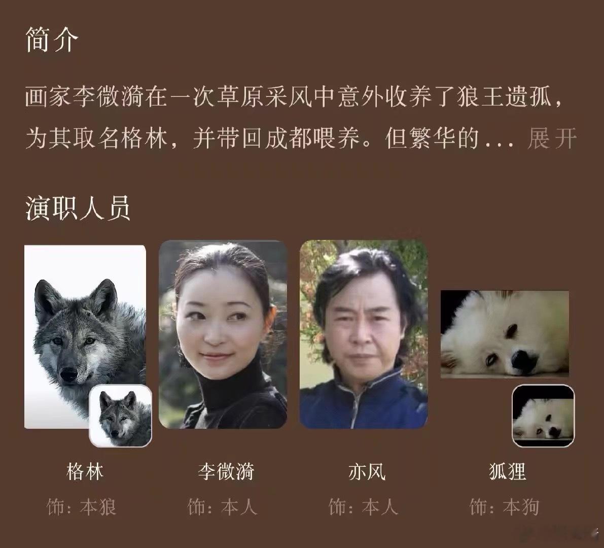以防你们不知道,重返狼群的电影演员名单人在扮演本人,狼在扮演本狼。