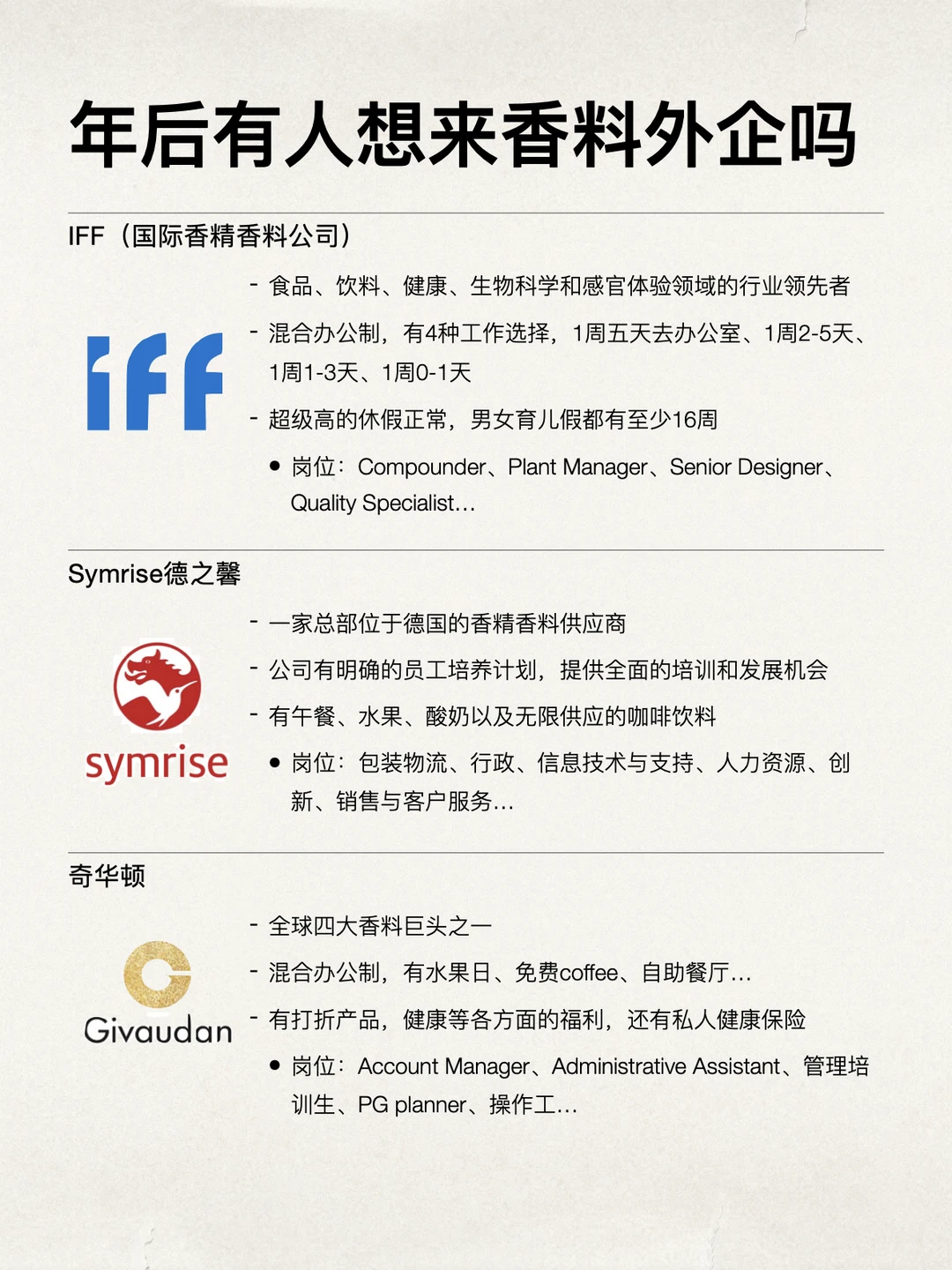 很多人第一次听香料外企都会觉得陌生。但其实我们每天接触的味道,几乎都来自他们,比如零食、饮料、香水、洗护、化妆品... 香料属于典型上游行业,不直接面向消费者,但业务非常稳,抗周期能力也强。岗位除了研发,像应用调香、市场、销售支持、供应链这些方向机会也不少 整体氛围偏稳不卷,一般都是955双休,年假12–15天起,有弹性工作制度,福利体系也很成熟,对女生很友好 坚持日更✊🏻,对外企感兴趣的欢迎常来看看