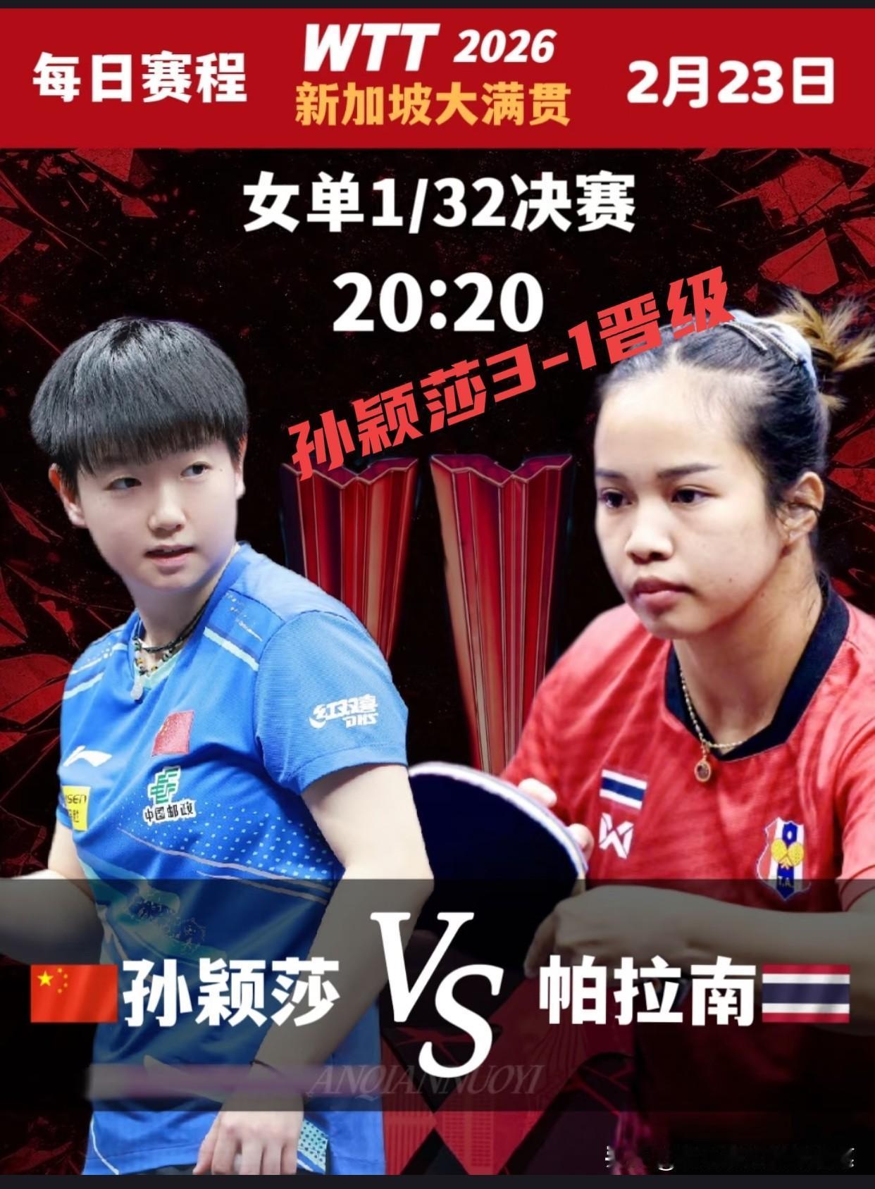孙颖莎3-1帕拉南迎来开门红! 孙颖莎最后一局的最后两分,真的是太精彩啦,全场鼓掌👏! 帕拉南,从资格赛一轮一轮好不容易碰上世界第一孙颖莎,拼得真是又凶又狠,能赢一局也是莫大的荣幸! 帕拉南一定在想自己的签太硬了!要不是是遇上孙颖莎也许还会走得远一点儿。 其实很多人都是这样想的,又想和孙颖莎交手,又怕遇到孙颖莎,遇到了就不要老命的拼,拼赢了一战成名,拼输也不亏! 只不过孙颖莎那是那么好赢的呢? 冬日生活打卡季