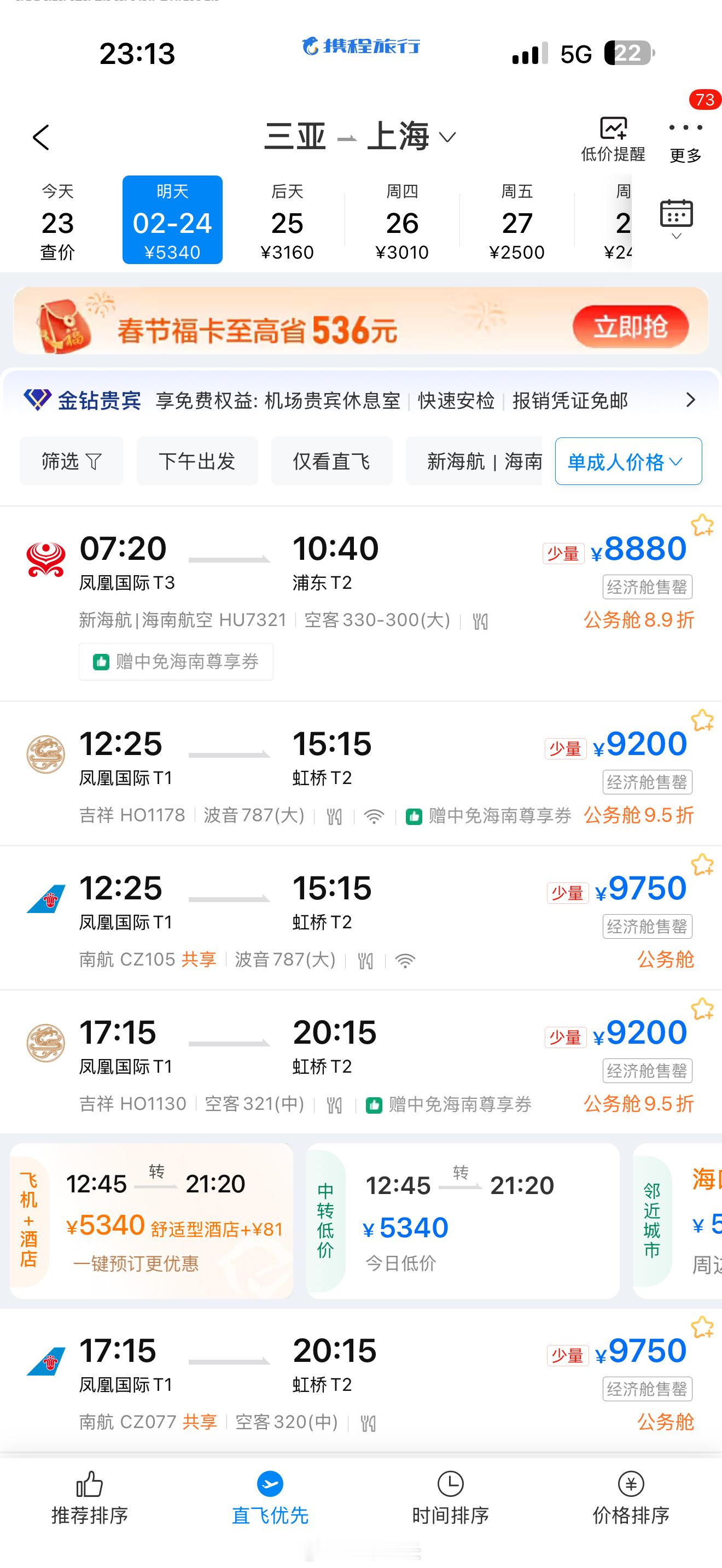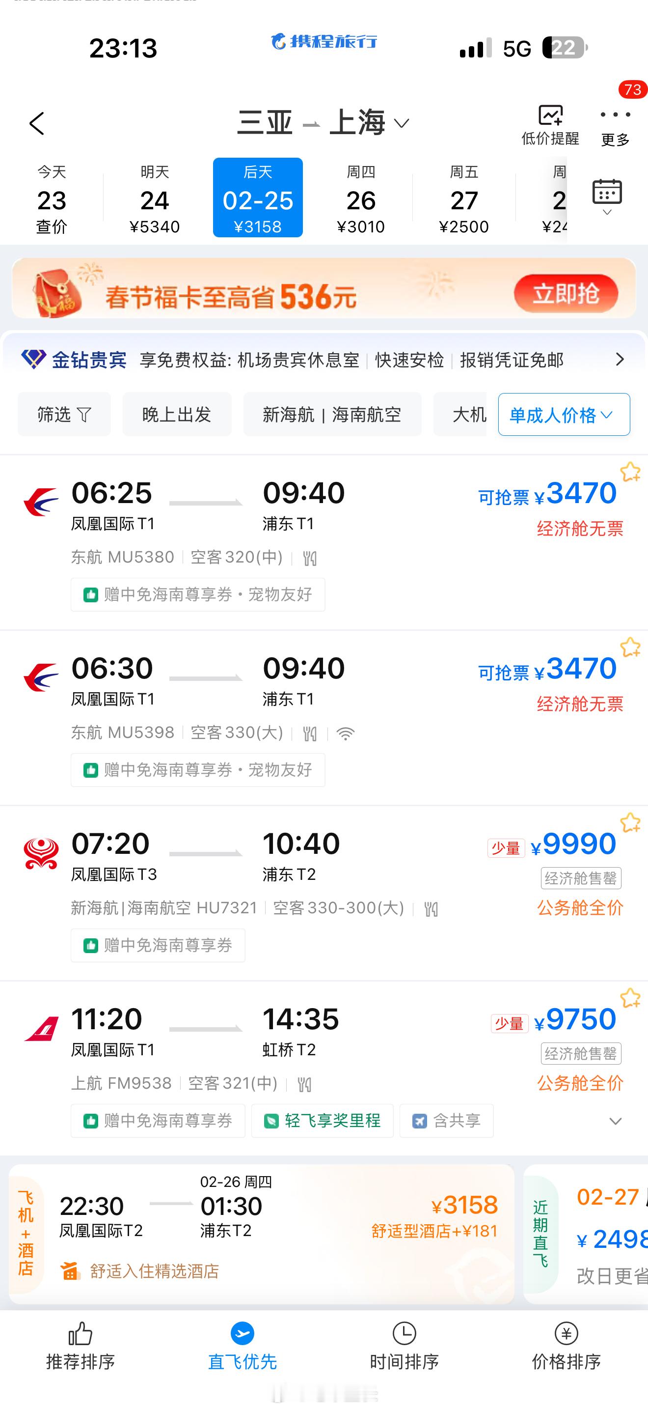 感受一下三亚回上海北京的机票,经济舱全部售罄,公务舱的价格也直逼万元了。