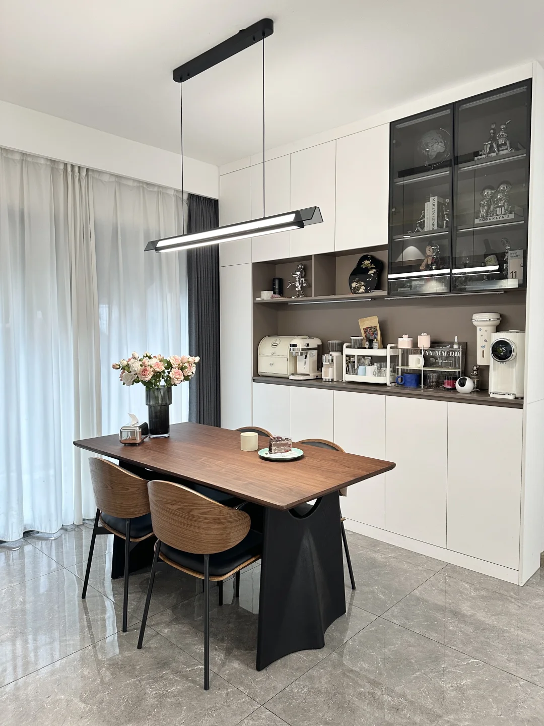 ✅餐厅开间3米,做了满墙餐边柜,集收纳,整体配色白色➕棕色!整个柜子都是隐形拉手,简约大方!餐桌尺寸选择1.6✖️0.8