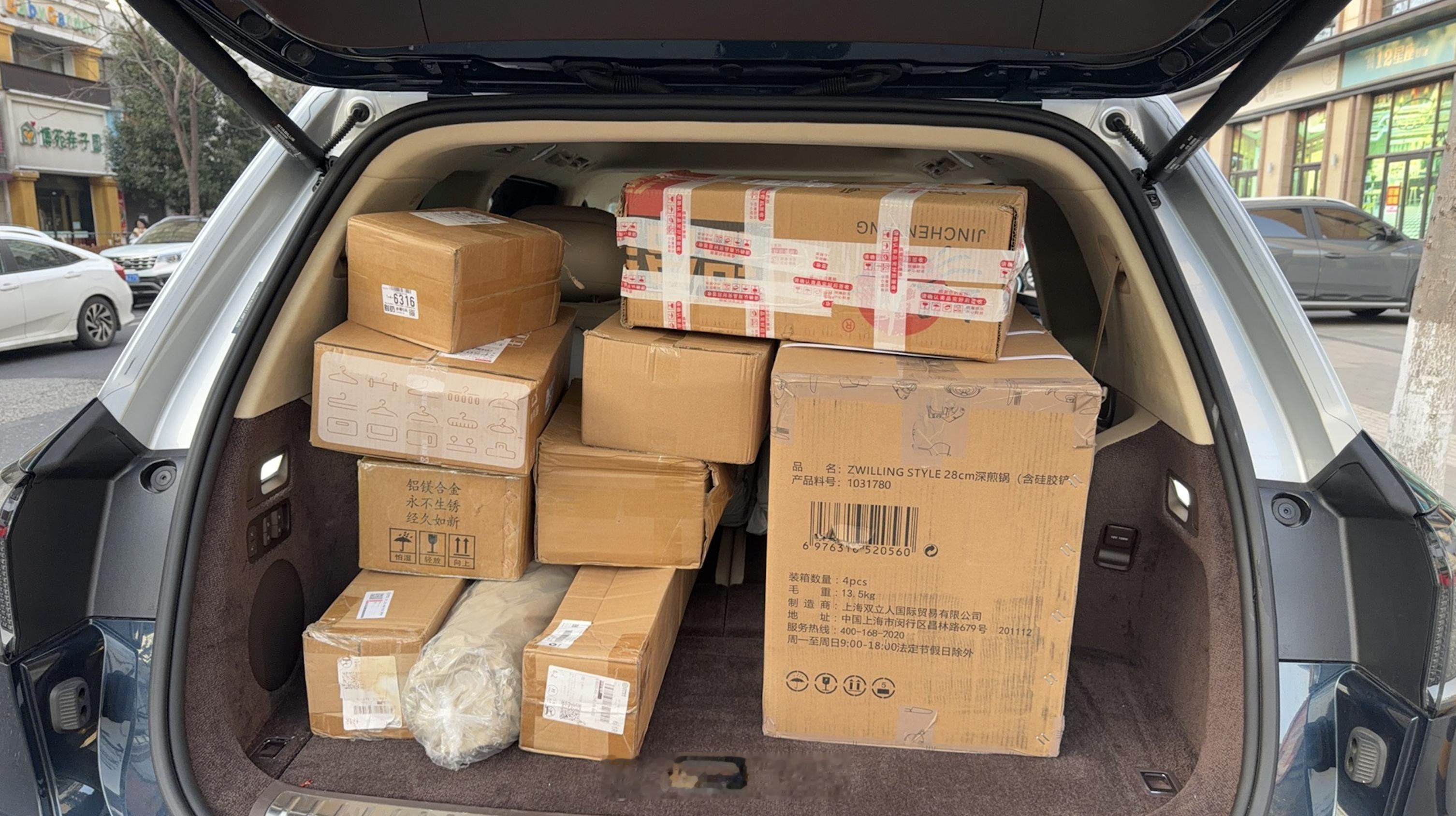 春节回家免不了行李满载,第三排放倒后也是塞得满满当当,问界 M9 还是挺能装的,全部放下。