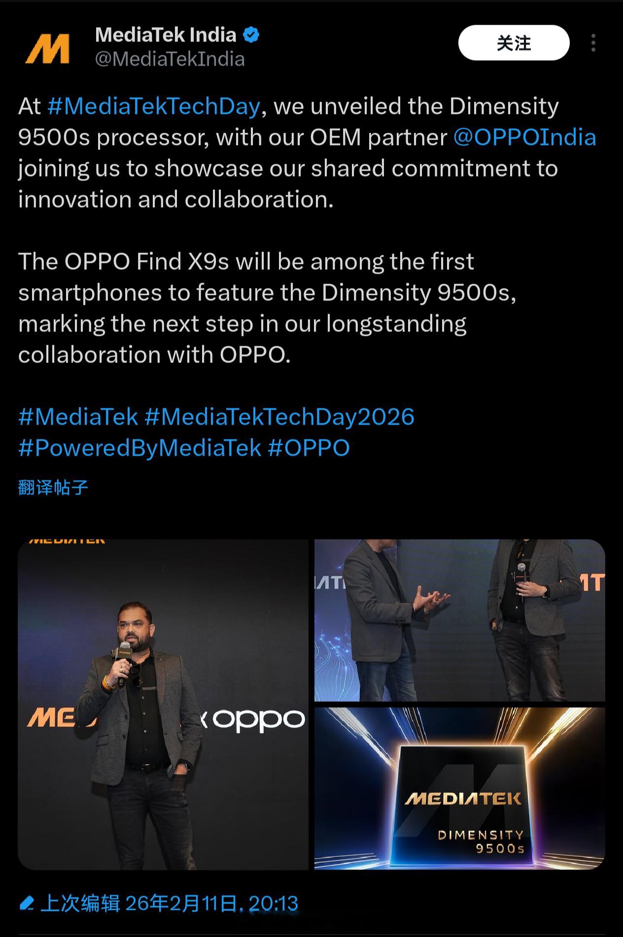 安卓旗舰的『降配』先从海外版产品开始……联发科印度公司前段时间在印度发布天玑 9500s 的时候,OPPO 就同场宣布印度版 Find X9s 将会首批搭载天玑 9500s。
