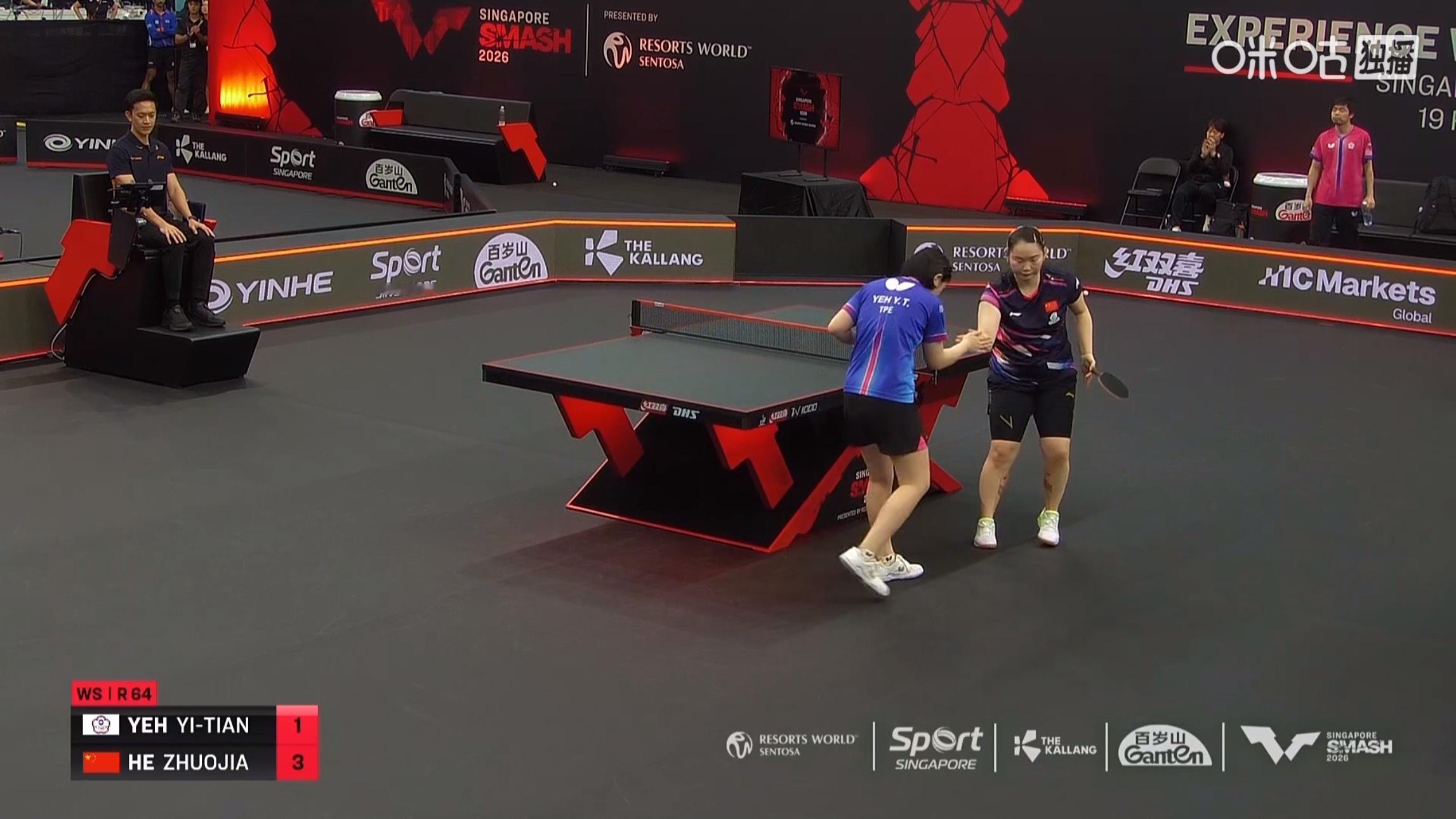 何卓佳3比1叶伊恬(11-5,11-6,8-11,13-11)晋级WTT新加坡大满贯2026 女单第二轮