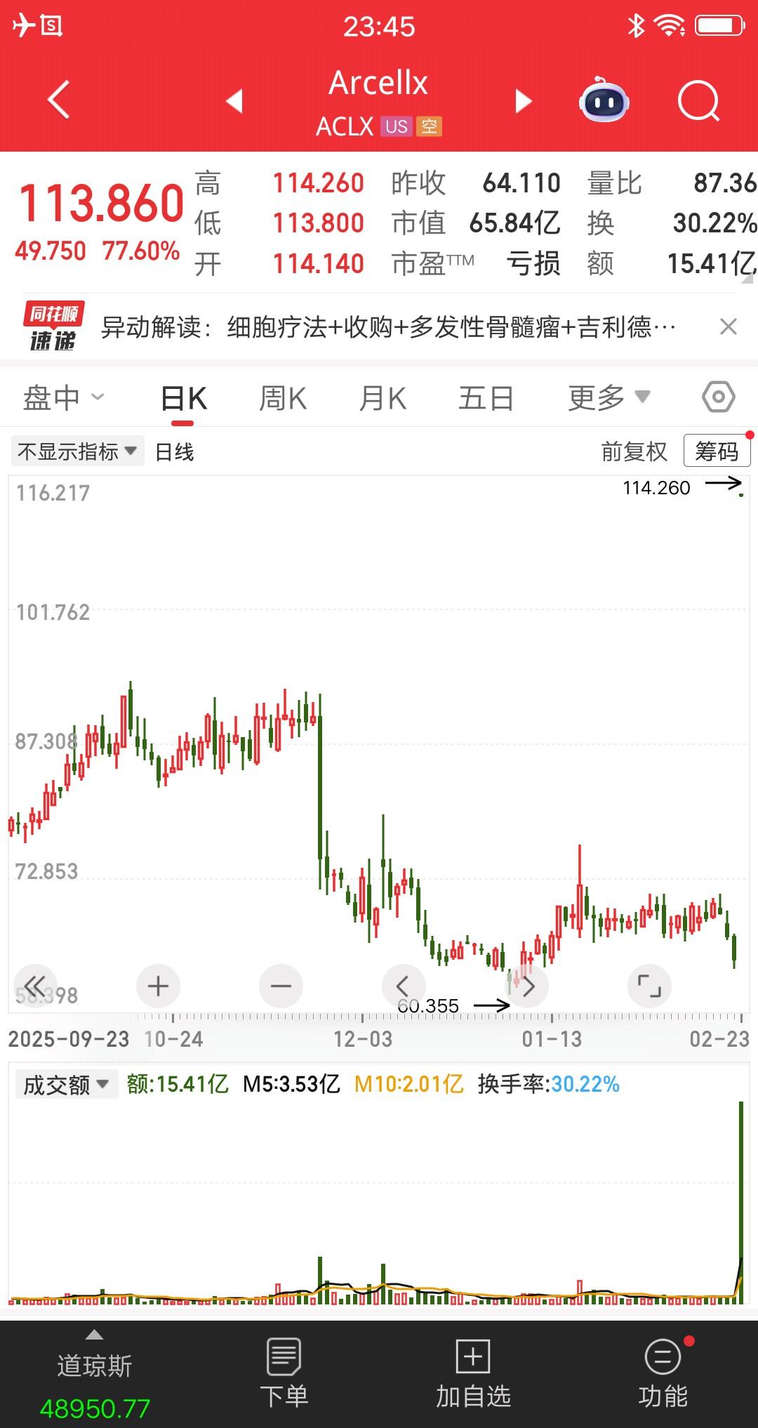 一天暴涨77%,简直屌爆了。该票昨日收盘价为64美元,今天开盘就干到了114美元,成交额暴增十几倍。 提前埋伏的资金,运气爆崩,赚翻了。 该票营业收入2063万美元,利润亏损1.71亿,妥妥的绩差股呀,凭啥能涨这么多呢? 吉利德科学宣布,以每股115美元现金收购公司股票,交易价值为78亿美元。 吉利德科学是全球顶尖生物制药公司,市值1864亿美元。2025年报,营收294.43亿美元,净利润85.1亿美元。 被大金主看上了,公司的价值瞬间提上去了,山鸡秒变凤凰呀! 要是有内幕消息,提前买进去,那就爽呆了,真让人羡慕嫉妒恨呀!