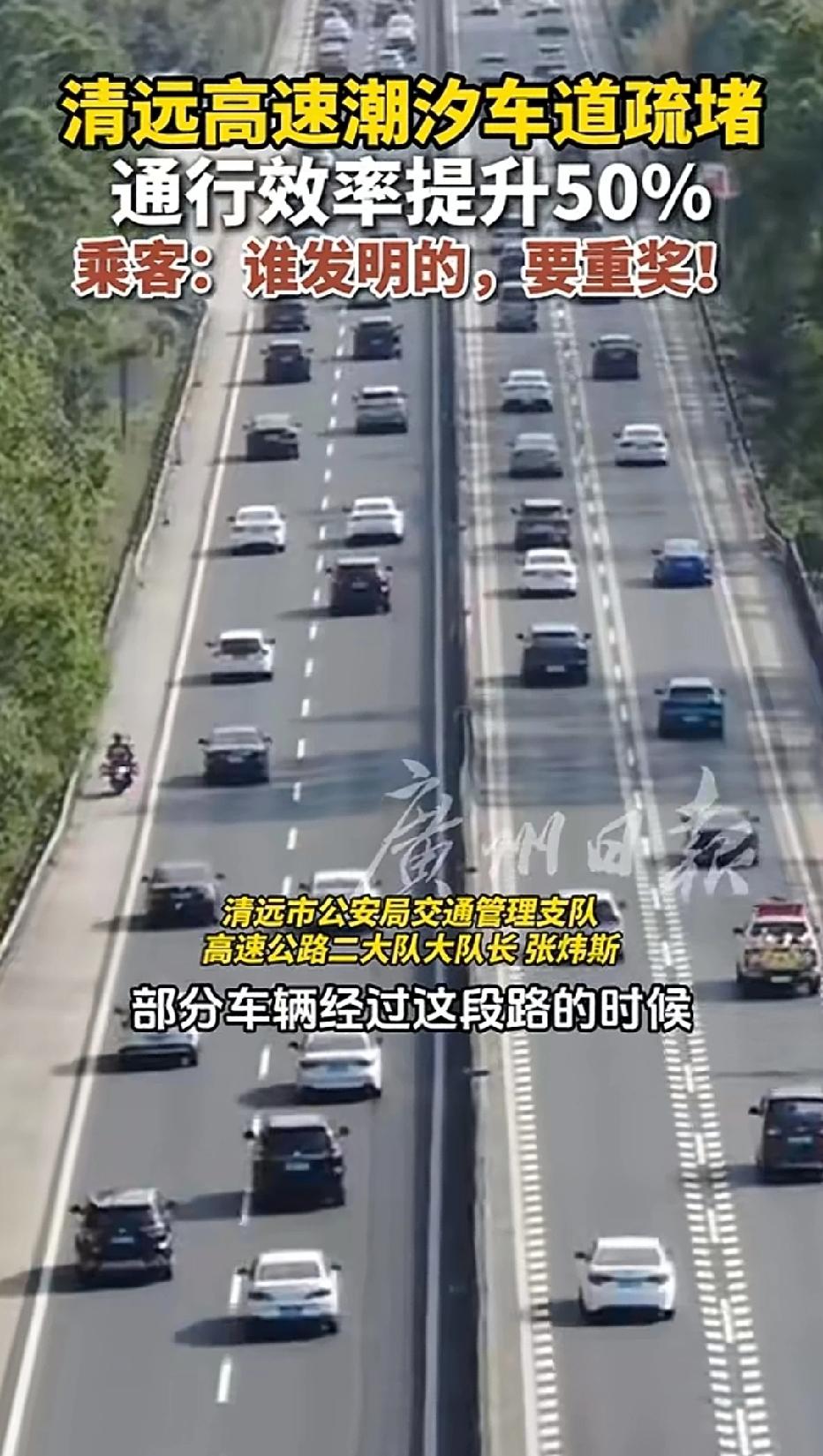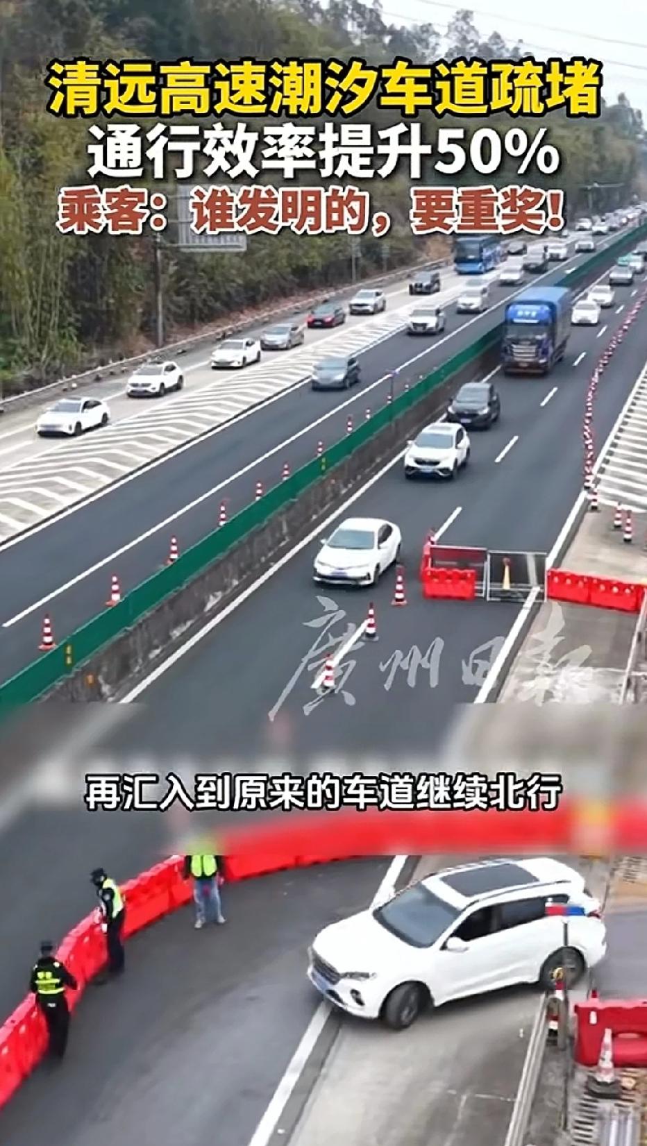 近日广东清远,一高速路上发明了一个800米的潮汐车道,极大地疏通了交通的拥堵情况,有人甚至说应该重奖发明这个潮汐车道的人! 最近春节返程高峰期,不少司机遇到路途中堵车的情况,一等就是三四个小时,苦不堪言啊,在清远的一条高速路上,有司机发现这里竟然有潮汐车道,北向行驶的部分车辆遇到拥堵时,可以借道南向的车道行驶,经过一个800米的潮汐车道,然后又重新汇入北向车道,极大的解决了高速路上的堵车情况!