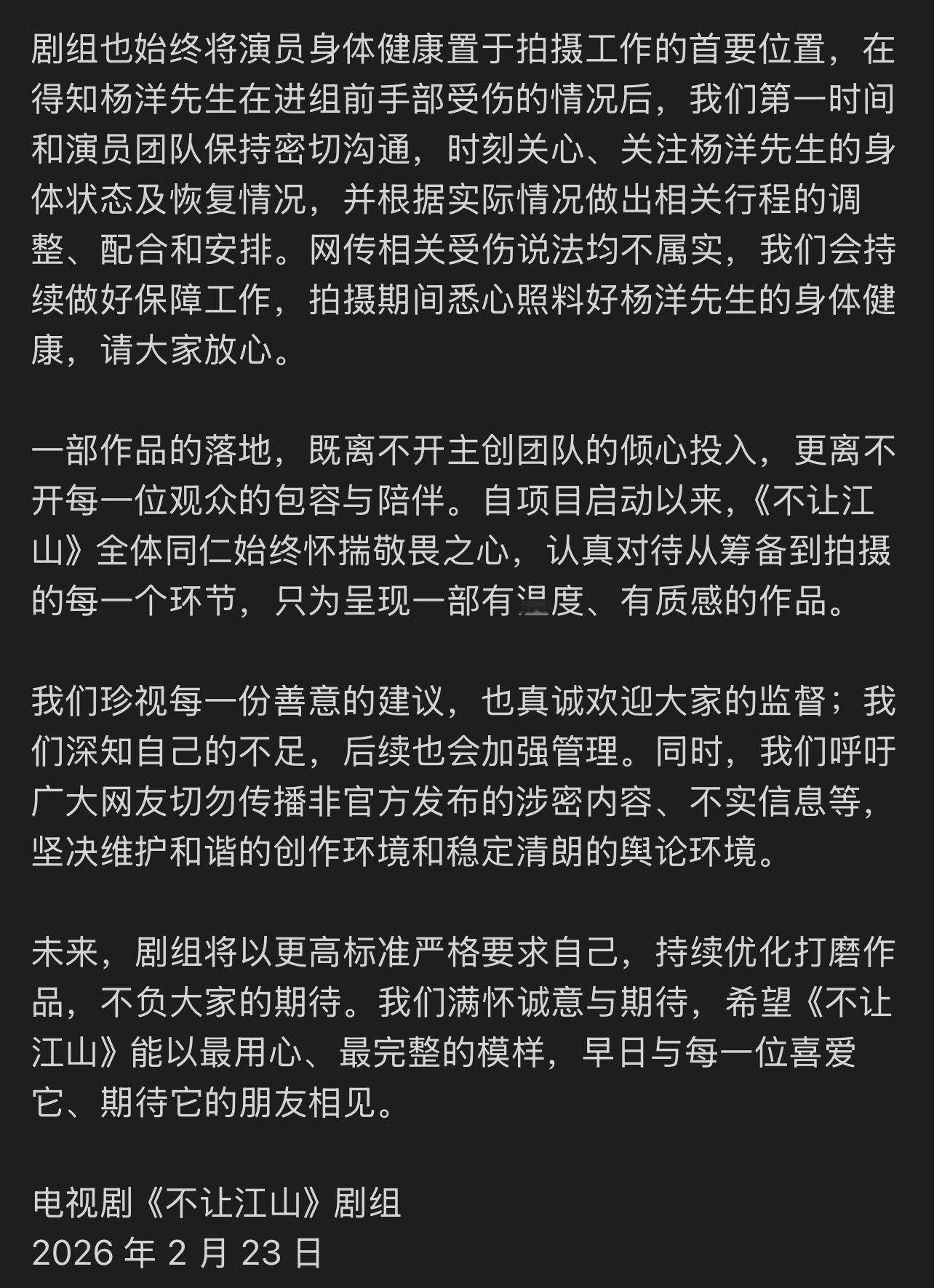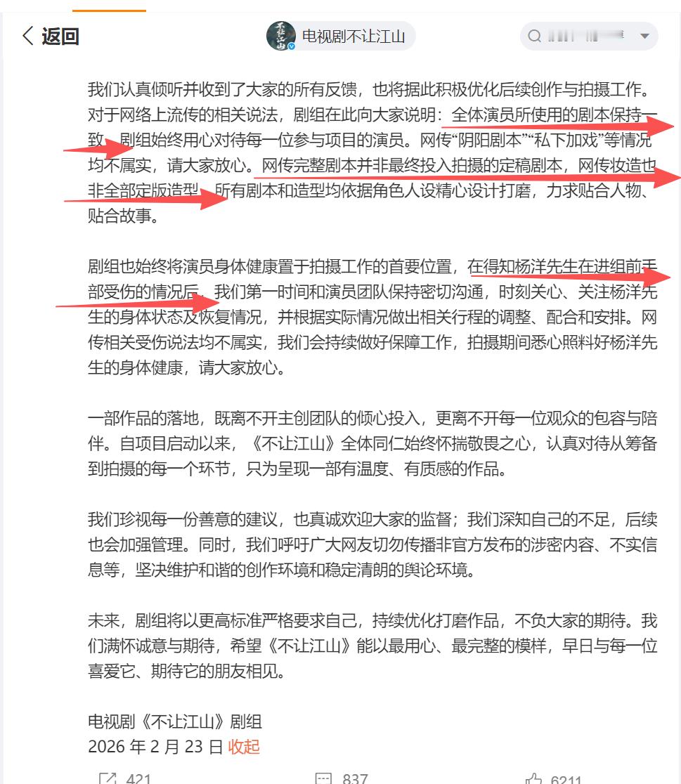 不让江山剧组发布声明现在很多剧组的声明都被吐槽是“废话文学”,但《不让江山》,这次的回应还是很真诚的,感觉是有花了时间去了解、去调查,然后一一给出了针对性的反馈。这种“把粉丝的舆情认真当个事儿办”的态度,现在不多见了。声明里对杨洋核心地位的维护,对原著的尊重,都表达得很清楚。希望这份真诚能延续到拍摄中,最终呈现一部好作品。