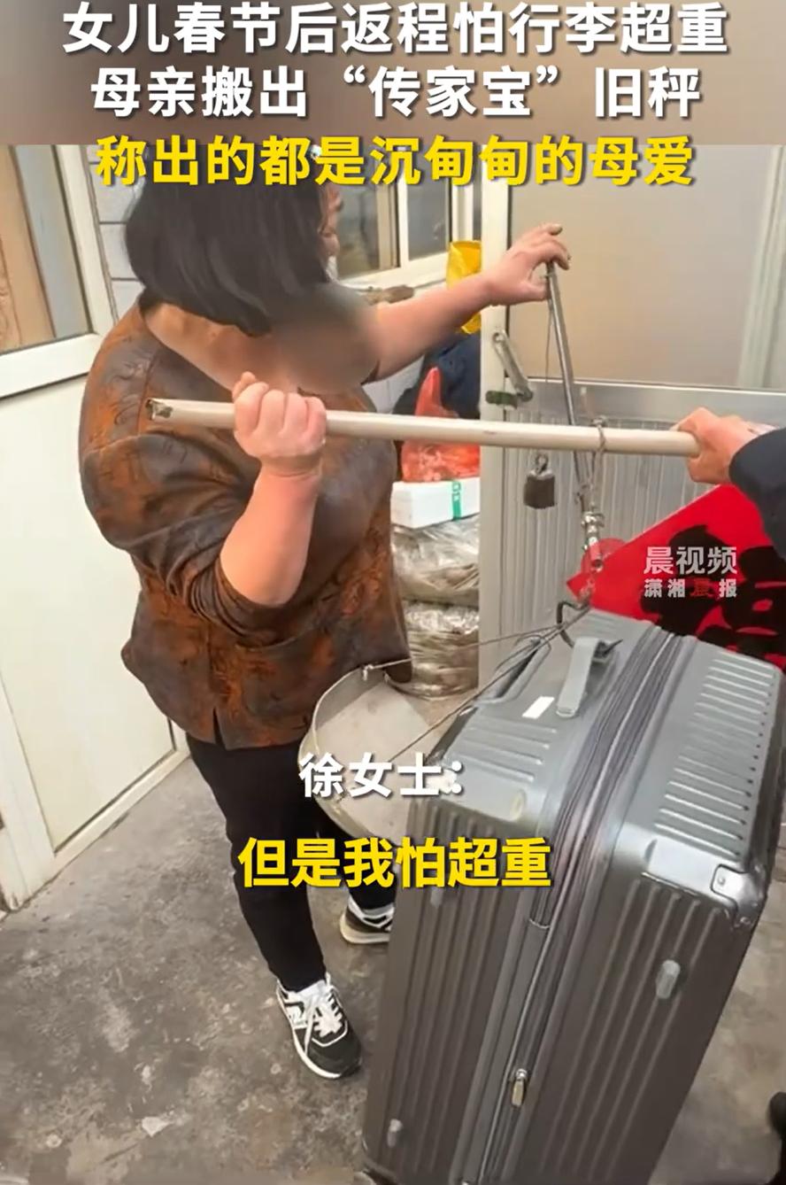 笑着笑着就哭了!山东潍坊,女子过完年准备回国外上班,妈妈特意做了不少家乡的食物放到了行李箱中,女子怕行李超重不想带,没成想,妈妈直接从家里搬出“传家宝”旧秤来给行李箱称重,然后信誓旦旦的表示:绝对没超! 徐女士自己在国外工作,春节回家过年后准备返程妈妈提前张罗着给塞了一大堆家乡的豆包、馒头,恨不得把整个厨房都装进女儿行李箱 徐女士心里犯嘀咕,怕行李超重,就试着跟妈妈说少带点,要不这次就算了。结果妈妈也不争辩,转身从屋里翻出一把老式杠杆秤,铁杆子上都生锈了,也不知道在家里躺了多少年 一番操作后,直接把行李箱搬起来称重,认认真真拨动秤砣,然后抬头,一脸笃定:你看,绝对没超,我称过了 那一刻,徐女士觉得妈妈又认真又可爱,顺手拍了下来 她说妈妈今年62岁,用起这把老秤还是那么熟练。那秤可能很多年没人碰过了,但妈妈用它称过她的童年,称过一家人的柴米油盐,如今又用它来称一份远行的牵挂 有网友说:这里面装的哪是馒头,装满了父母的爱和不舍 确实,看到这个视频的人,大概都想起了自己离家时的场景。行李箱被塞得满满当当,妈妈做的腊肠、姥姥腌的咸菜、爸爸偷偷放进去的水果,明明超市里都买得到,可他们总觉得你带走的这一份不一样 那些食物到了异乡,打开行李箱的那一刻,扑面而来的不只是香气,还有那个热气腾腾的厨房,和站在厨房里盼你回家的身影 父母的爱,有时候就是这样不讲道理。他们不擅长说我想你,不习惯表达不舍,于是把所有的情感都塞进了那个小小的行李箱里 你嫌重,他们不反驳,只是默默地找出一把秤,证明给你看。其实他们证明的不是重量,而是一份心意,能给你的,都给你,哪怕只是一口家乡的馒头,也想让你在异国他乡,尝到家的味道