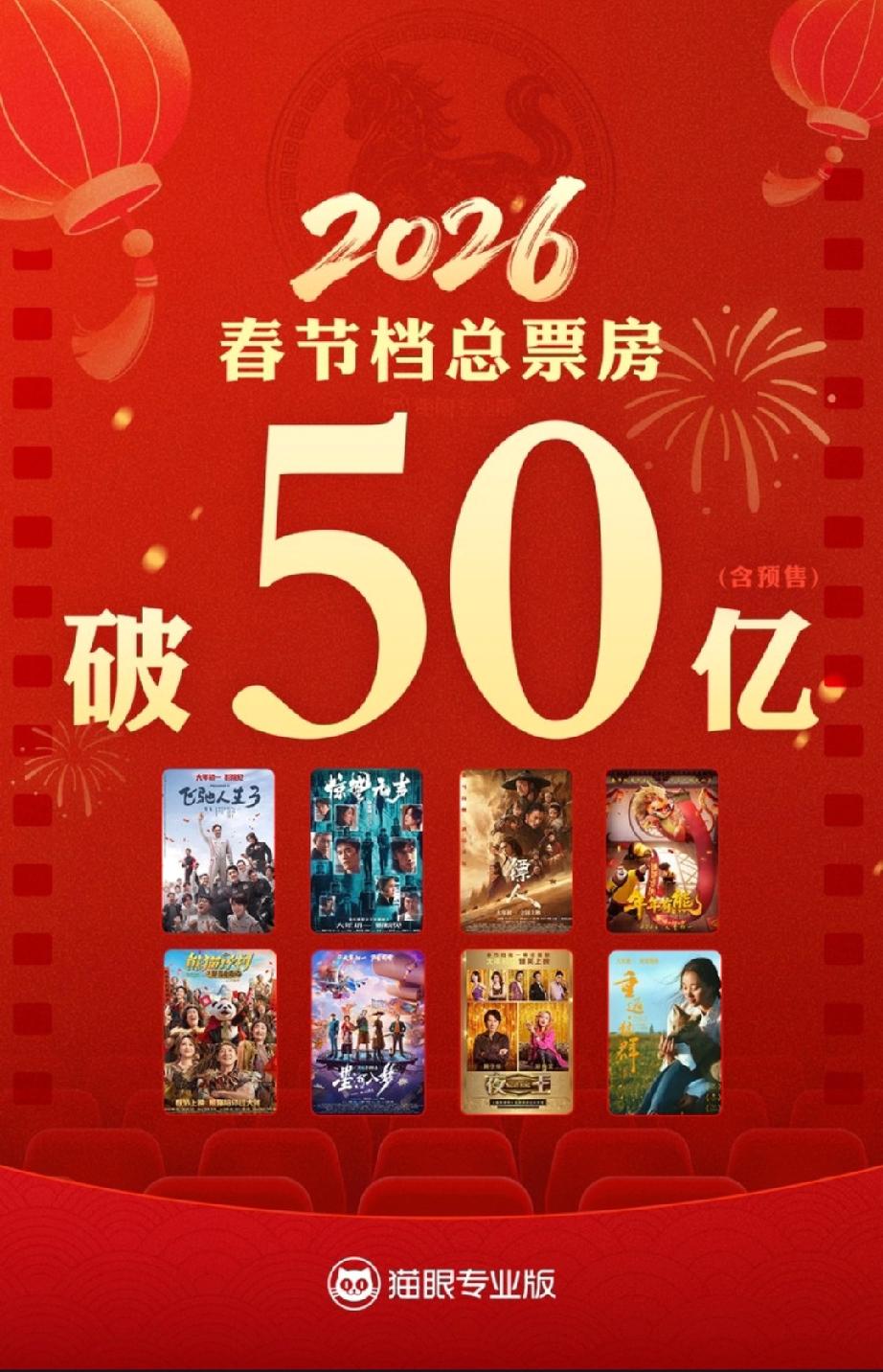 2026春节档票房狂飙:破50亿创史,中国影市登顶全球 2026马年春节档燃爆收官!腊月二十八至正月初七十天黄金档,电影市场全线飘红,总票房强势突破50亿,刷新影史春节档纪录,观影人次破亿,连续8年坐稳春节档亿级人次大盘,成为新年俗里最亮眼的文化消费。 档期内影片百花齐放,《飞驰人生3》《惊蛰无声》《镖人:风起大漠》《熊出没·年年有熊》 四大头部作品领跑票房榜,覆盖喜剧、悬疑、武侠、亲子全年龄段需求。其中国漫武侠力作《镖人:风起大漠》凭借大漠实景拍摄、硬核打戏与厚重武侠美学圈粉无数,让传统武侠文化在大银幕重焕生机;《飞驰人生3》延续热血喜剧内核,成档期票房担当;《熊出没·年年有熊》依旧是亲子观影首选,稳坐合家欢票房宝座。 更振奋的是,2026年中国电影全年总票房已突破75亿,成功超越北美市场,登顶全球单一电影市场票房榜首!春节档不仅交出票房佳绩,更带动影院周边、文旅、餐饮等电影经济全链繁荣,成为假日经济核心引擎,用光影力量点燃全民消费热情,书写中国电影市场高质量发展新篇章。 新春票房 票房排行 贺岁档电影票房