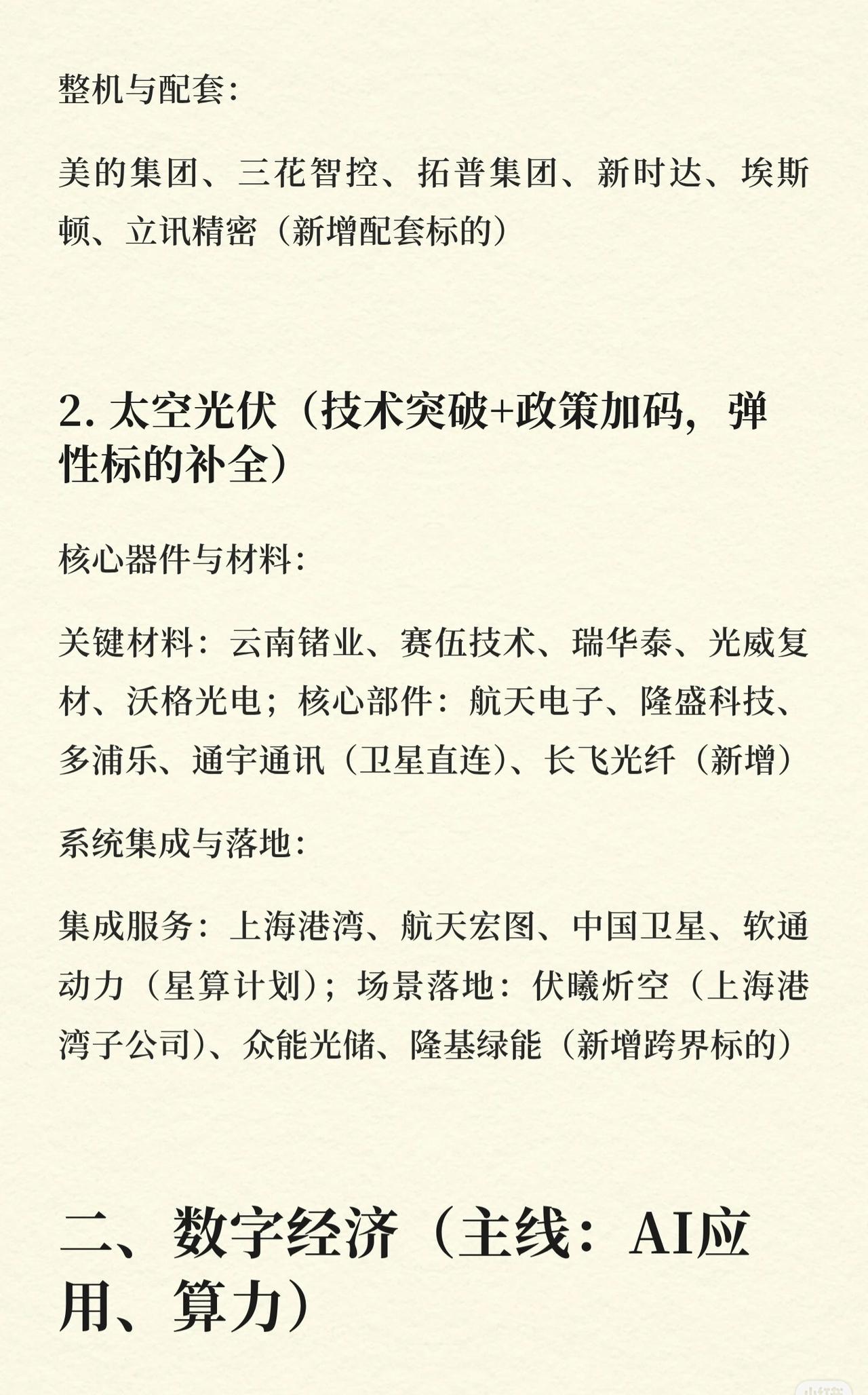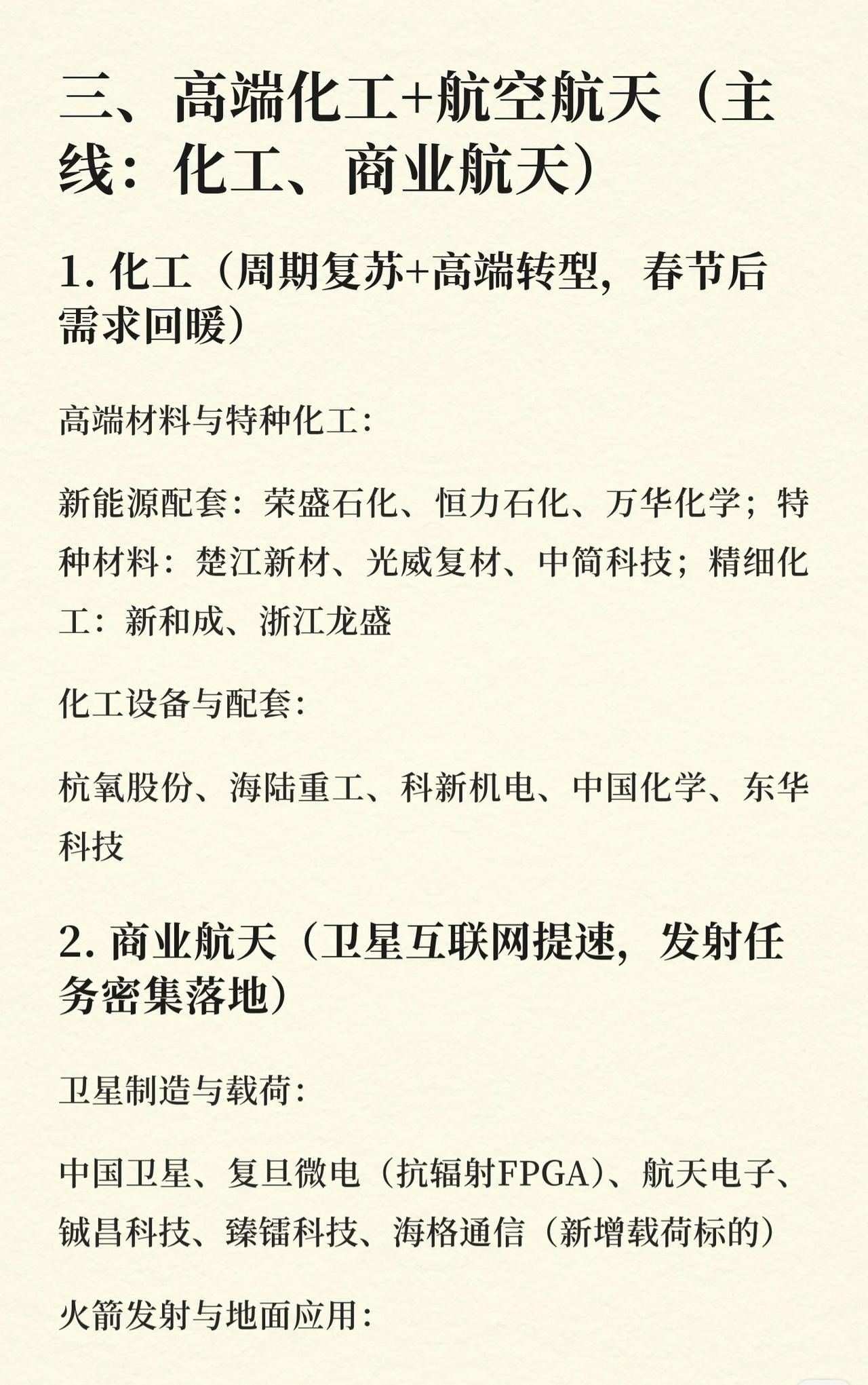 春节后投资重点关注三大方向及对应主线、核心标的如下: 1. 高端制造+前沿科技:主线为人形机器人(量产催化零部件景气,含绿的谐波、汇川技术等)、太空光伏(技术突破+政策加码,含云南锗业、航天电子等); 2. 数字经济:主线为AI应用(场景渗透加速,含金山办公、科大讯飞等)、算力(供需缺口大,含浪潮信息、中际旭创等); 3. 高端化工+航空航天:主线为化工(周期复苏+高端转型,含万华化学、荣盛石化等)、商业航天(卫星互联网提速,含中国卫星、铖昌科技等,及火箭发射/地面应用标的中航产融、中国卫通等)。