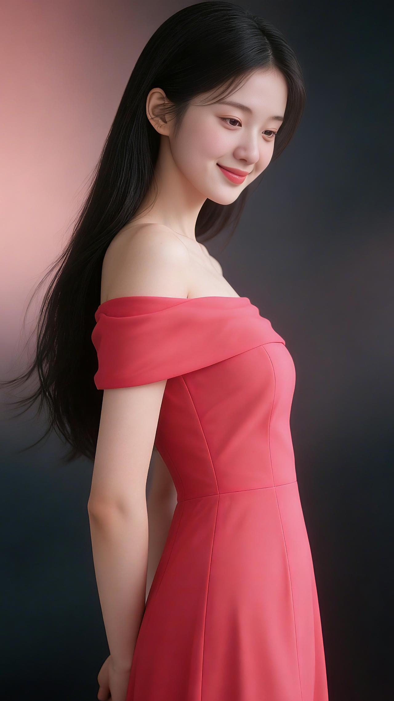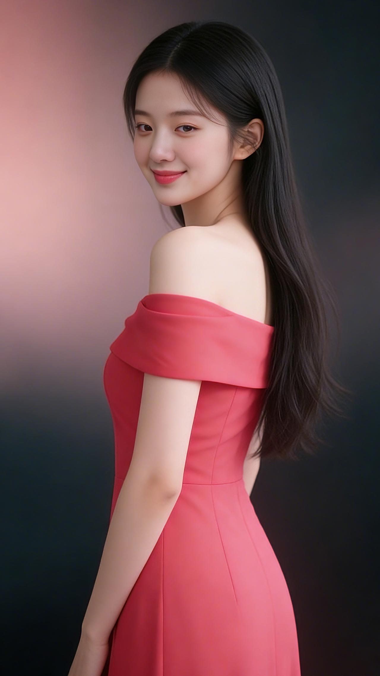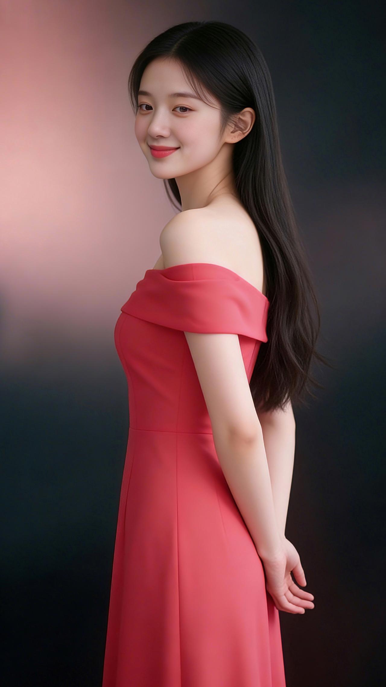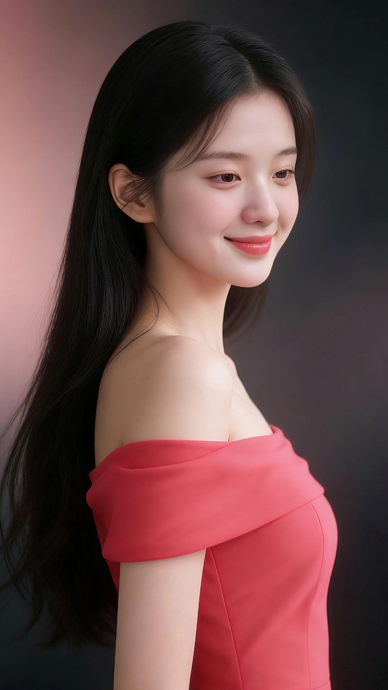 九帧同绘玫红露肩仙。乌发如瀑垂落亮泽,玫红裙展柔肩线,侧立浅笑眉眼含情。粉黑渐变背景衬静谧,温婉妩媚东方韵漫帧,浪漫如诗一眼沦陷! 图片为Al辅助完成,请注意甄别!