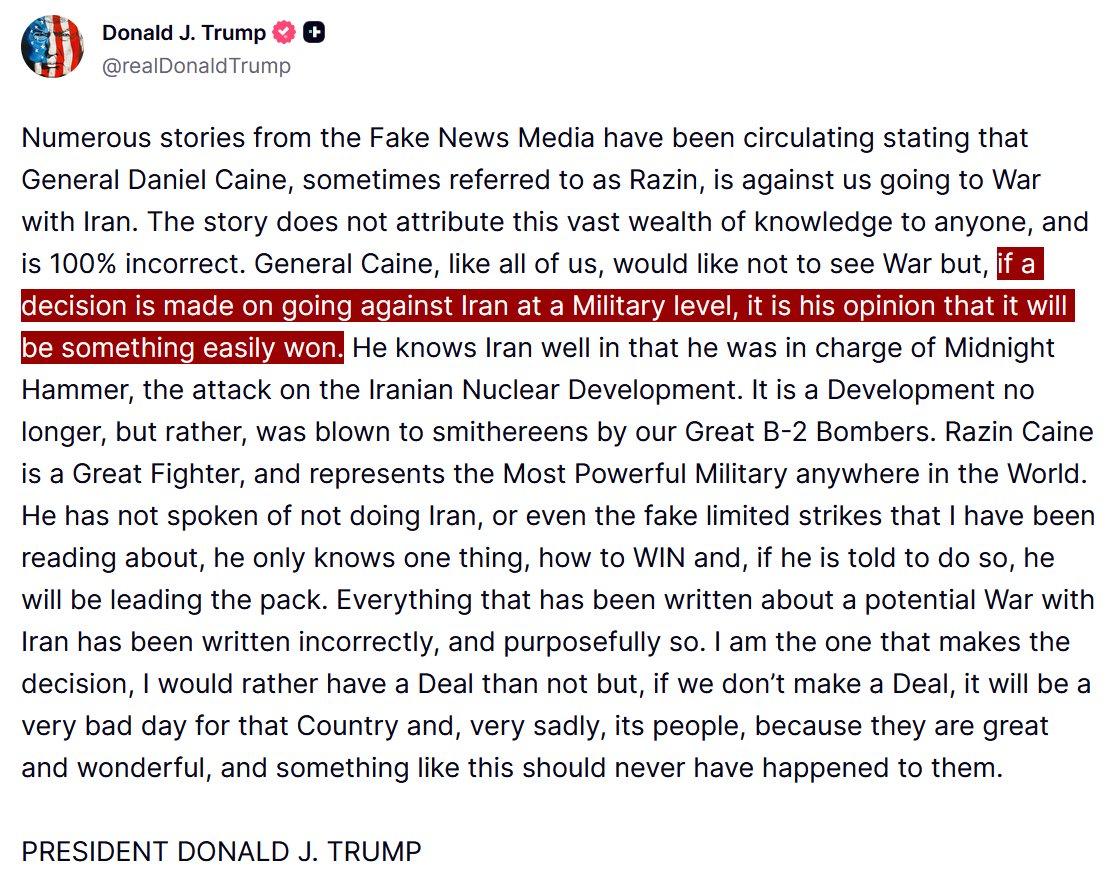 新闻快讯——特朗普称,有关五角大楼警告他不要攻击伊朗的报道“100%错误”,并表示如果美军与伊朗开战,“这将是一场轻松获胜的战争”。