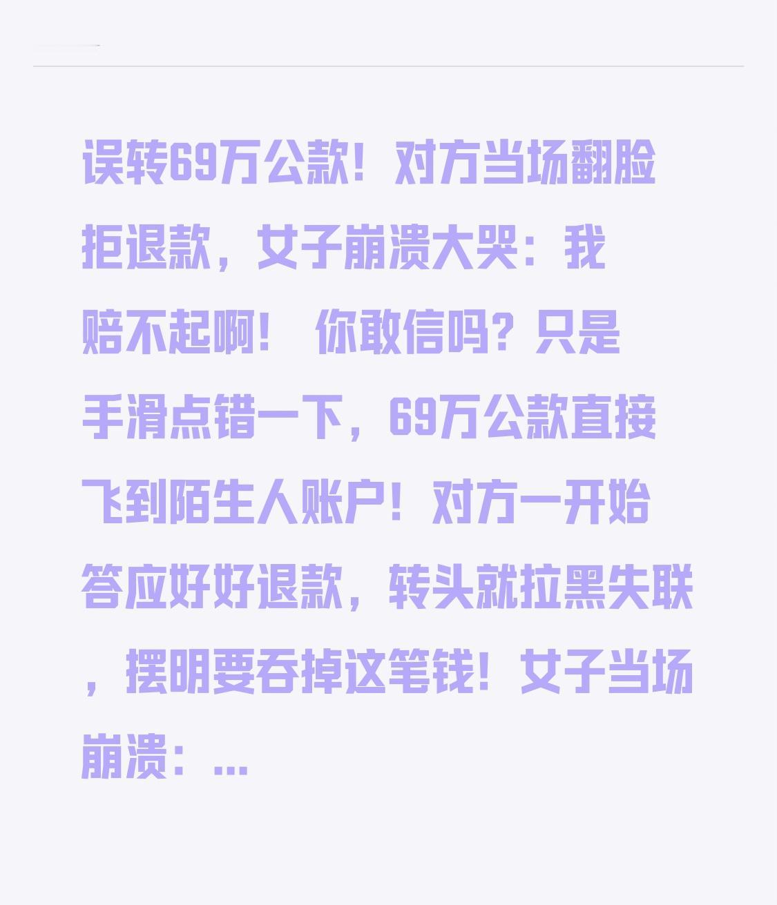误转69万公款!对方当场翻脸拒退款,女子崩溃大哭:我赔不起啊! 你敢信吗?只是手滑点错一下,69万公款直接飞到陌生人账户!对方一开始答应好好退款,转头就拉黑失联,摆明要吞掉这笔钱!女子当场崩溃:这是公司的钱,我一辈子都赔不起! 苏州李女士是公司HR,年底忙昏头,转账时手一抖,把本该发给公司的69万公款,误转给了云南一位前租客。发现转错那一刻,李女士直接吓瘫,天旋地转——这不是几百几千,是近70万公款! 她第一时间联系对方,对方一开始还客气,说“马上退”。可李女士左等右等,钱没到账,再发消息,对方直接变卦:不退款、不配合、玩失踪! 李女士求银行冻结账户,银行说无权私自冻结;找对方协商,对方态度嚣张,摆明了“钱到我手,凭本事拿的为什么要还”!李女士急得整夜睡不着,一边是公司催款,一边是对方耍赖,她哭着说:我就是打一辈子工,也赔不起这么多钱! 本以为这笔钱要打水漂,剧情突然大反转!走投无路的李女士报警求助,警方立刻启动保护性止付,直接锁定账户,防止对方转移财产!随后两地警方跨省联动,上门普法,明确告知:误转的钱属于不当得利,拒不退还涉嫌违法犯罪,轻则强制执行,重则坐牢! 对方一听要负刑事责任,瞬间怂了,再也不敢嚣张。最终在警方全程见证下,69万公款一分不少全部退回!拿到钱的那一刻,李女士当场崩溃大哭,悬了几天的心终于落地。 这件事太让人揪心了!谁都有手忙脚乱、点错屏幕的时候,但不是你的钱,一分都不能拿!贪一时便宜,可能毁了自己一生,法律绝不会纵容贪心之人! 同时也给所有人敲响警钟:大额转账一定要反复核对姓名、账号,能开延时到账就开延时到账,多一步确认,少一场崩溃! 做人守住底线,做事守住细心。愿我们都不贪意外之财,不犯致命失误,平平安安过日子。