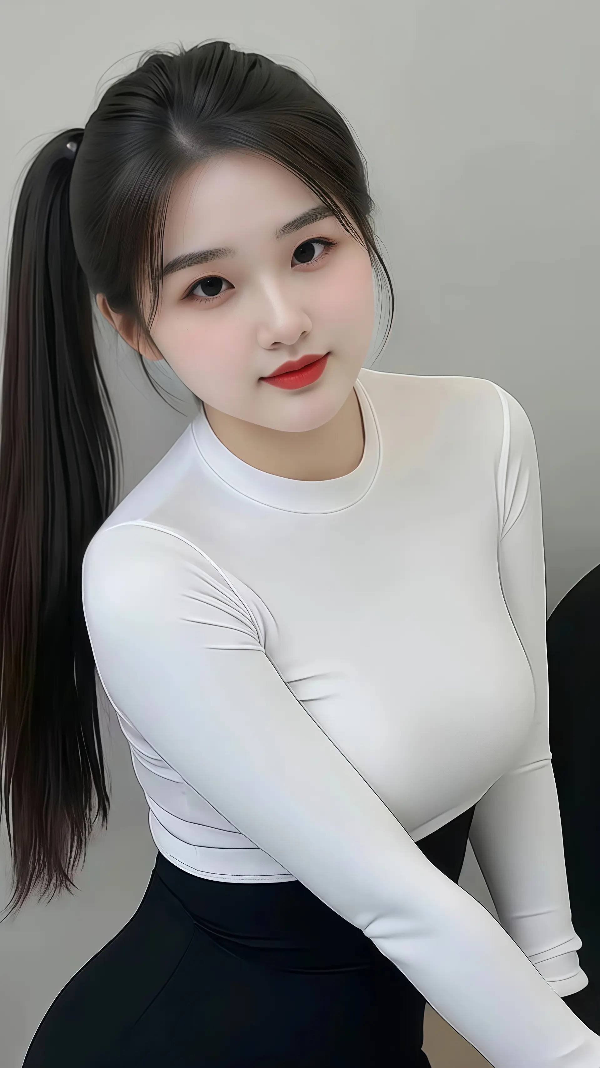 18岁女大学生,尖下巴,三庭五眼比例均衡,棕色简约盘发。身材娇小,细腻陶瓷水嫩肌