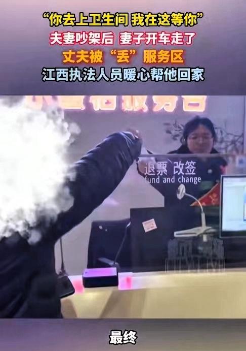 太狠心!2 月 21 日,江西抚州广昌西服务区,福建一男子和妻子发生争执,妻子骗他去上厕所,说会在原地等他 丈夫没有多想,空着手便下了车。可等他从洗手间出来时,眼前的一幕让他愣住了。妻子已经带着孩子开车离开,只留下他一个人在服务区。他身上没有现金,手机和钱包都留在车上,无法与家人取得联系,在陌生的环境里既无助又无奈,最后只能向现场执法人员求助。 执法人员了解情况后,一边安抚他的情绪,一边帮忙协调车票,还自掏腰包为他垫付路费、准备食物和水,最终帮助他顺利返回福建泉州。 此事在网上引发热议,不少网友认为妻子的做法过于极端,也有人觉得是长期情绪积累后的爆发。但冷静来看,夫妻之间有矛盾很正常,可无论争吵多激烈,都不应该用抛弃、欺骗的方式处理问题。 高速服务区人员复杂、环境陌生,将没有任何通讯和财物的伴侣独自留下,存在不小的安全隐患。一时的情绪宣泄,看似解气,实则会严重伤害彼此的信任与感情。婚姻不是较量输赢的地方,更不是发泄情绪的战场,再大的分歧,也不该拿对方的安全和尊严赌气。 好的婚姻,是吵得了架,也守得住底线。生气时不做决定,激动时不做绝事,懂得克制情绪、顾及对方,才是长久相处的关键。真正的安稳,从来不是争一时对错,而是彼此体谅、互相守护。