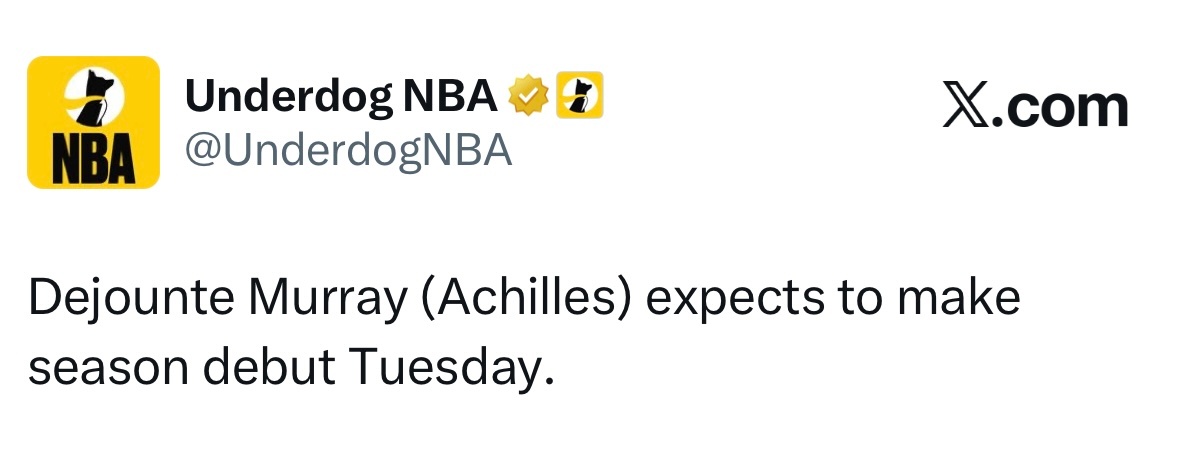 复出挑勇士,德章泰-默里预计明天在鹈鹕对阵勇士的比赛中复出。
