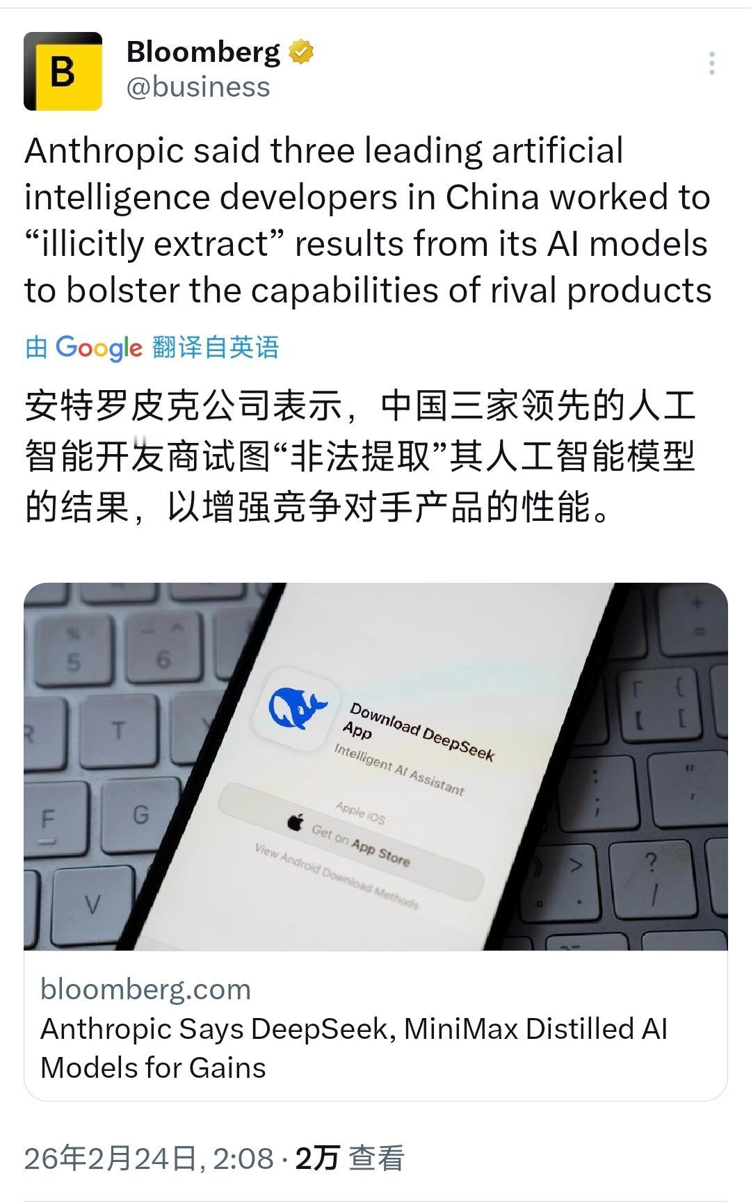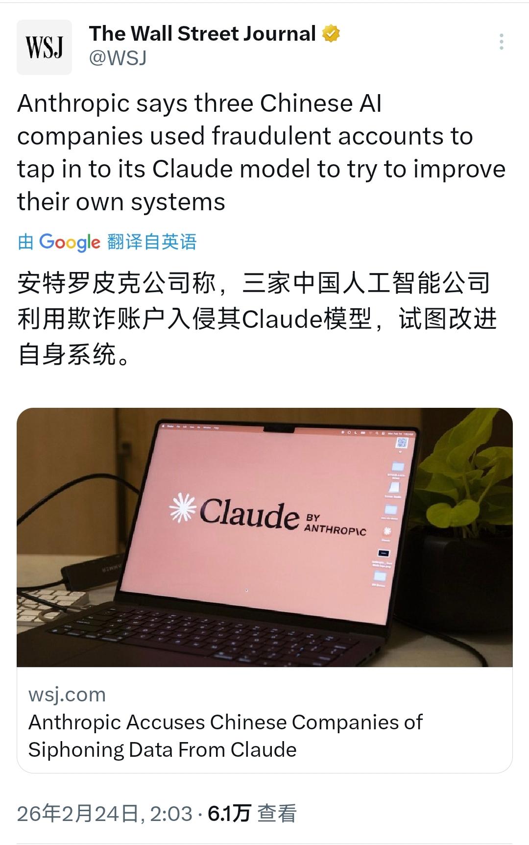 突发新闻:Anthropic 指控中国AI公司“非法蒸馏”他们的数据。 Anthropic今天(北京时间2月24日)发文写道:“我们发现DeepSeek、Moonshot Al和MiniMax对我们的模型发起了工业规模的蒸馏攻击。这些实验室创建了超过24000个欺诈账户,并与Claude进行了超过1600万次交易,提取了Claude的功能来训练和改进他们自己的模型。 蒸馏法是合理的:人工智能实验室利用蒸馏法为客户创建更小,更便宜的模型。但是,非法蒸馏美国模型的外国实验室可以移除安全措施,将模型能力输送到他们自己的军事,情报和监视系统中。” 多家美国媒体报道了Anthropic提出的指控,并指此类能力被应用于军事或监控系统,则会引发美国国家安全方面的担忧。 [机智]评几句:Anthropic指控中国AI企业对Claude发起“工业规模蒸馏攻击”,这场指控充满双重标准与道德虚伪,堪称AI行业的霸权闹剧。Anthropic无偿攫取全人类公开数据、海量版权内容训练模型,未支付分文稿酬,却将他人合规技术学习污名为“攻击”;它把互联网公共成果当作免费基础设施,自己尽情收割,一旦被逆向学习便立刻祭出私有产权大旗,本质是典型的技术寻租与垄断护盘。 经济学上这是竞争性学习溢出效应,创新本就源于知识流动与迭代,可Anthropic只想独享技术红利、筑起排他护城河,完全拒绝公平竞争。其一边靠全人类智慧获利,一边挥舞规则大棒打压后来者,还炒作军事与安全议题渲染威胁,道德弹性令人咋舌。这场指控无关技术正义,只是西方AI巨头维护垄断地位、遏制后发国家创新的政治操弄,彻底暴露技术霸权的利己本质与双标底色。