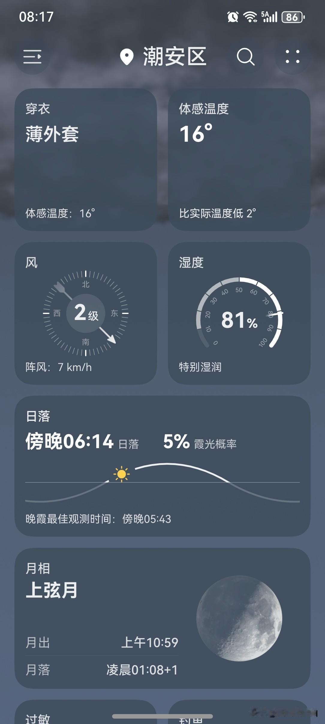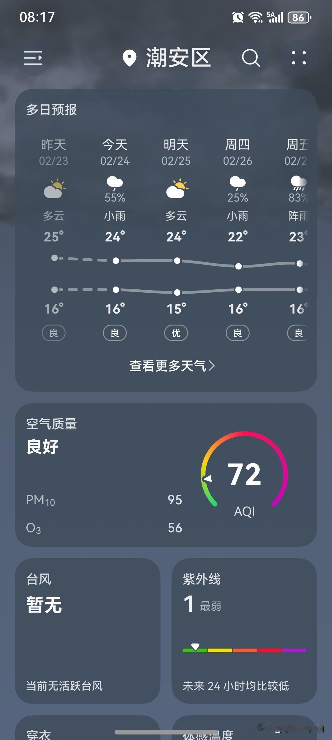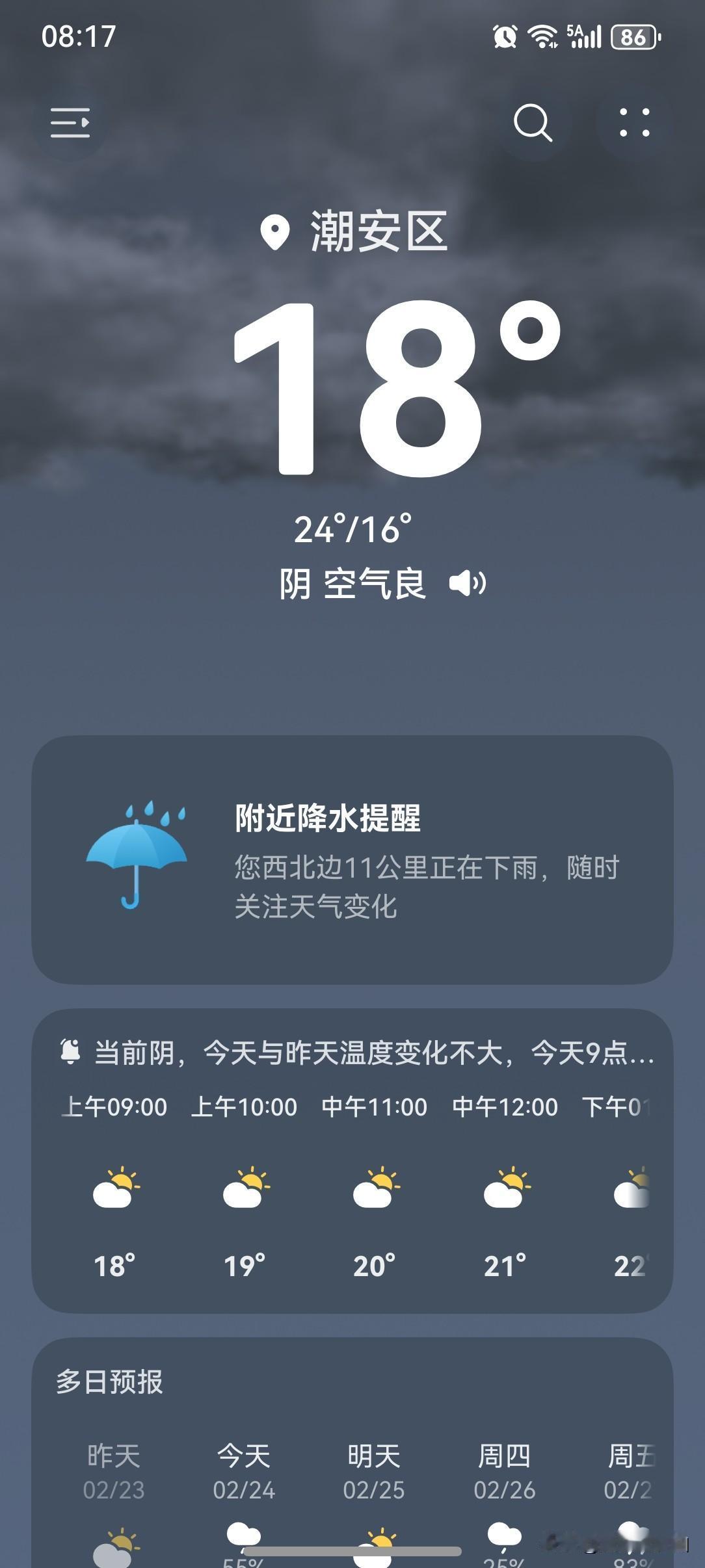 广东天气变脸→雨雾天气齐上线,还有冷空气也来开工啦! 未来几天(初八至初十),广东大部云量偏多早晚有(轻)雾,北部市县道路转湿滑,假期返程注意交通安全;24日白天到夜间,有弱冷空气南下我省,中北部气温小幅下降。 今天(24日),潮州阴天有小雨,气温16~24℃,此刻气温18℃,体感温度16℃。 今天潮州的天气画风突变,之前的晴朗天气转变为阴天,气温倒是还蛮高的,可以说是相当的暖和。 一起来看看今天的天空吧!今天的云量大增,持续多日的晴朗天气已转为阴天,天气阴沉,显得格外沉闷。 春节假期后的第一个工作日,太阳就开始罢工不上线营业了,大概是春节假期期间天天营业太辛苦了,是时候休息一下啦! 今天的天气,从整体来讲,还是值得一个好评的! 如此天气!元芳,你怎么看? [我想静静][大笑][笑哭][捂脸][我想静静][大笑][笑哭][捂脸]
