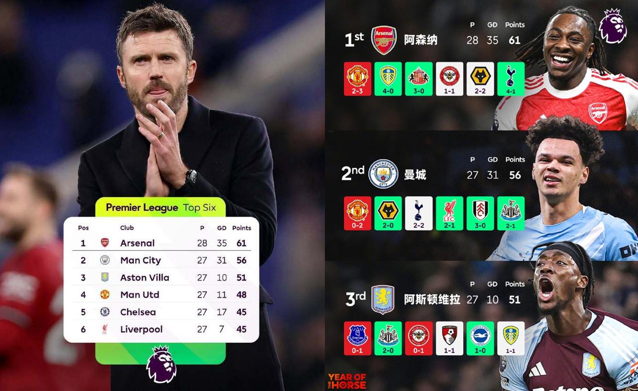 今年英超争五比争冠还激烈啊!欧冠区和保级区都要了老命了,后面场场都是血拼刺刀见红。 我觉得今年最后冠军应该是阿森纳的,曼城第二。 曼联估计第三,毕竟单线作战,势头已经起来了; 利物浦能不能第四就看最近几场比赛,最近几场全是下半区球队,拿了就有希望,和曼联比,利物浦还有欧冠要踢,会受影响; 维拉和切尔西估计一个第五,一个第六,两个队赛程都不好,我更看好埃梅里,毕竟埃梅里是老鸟,切尔西那个还是个新兵蛋子。