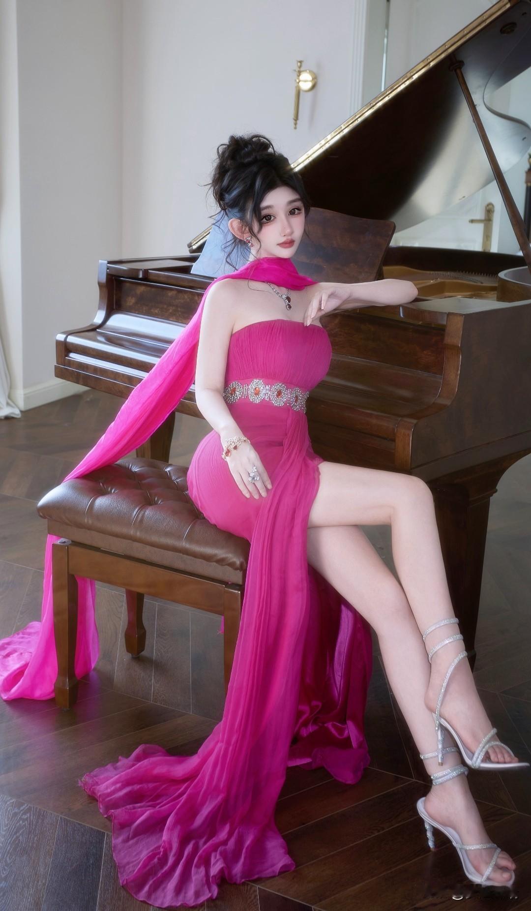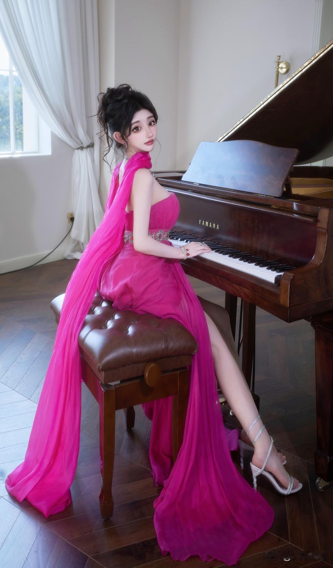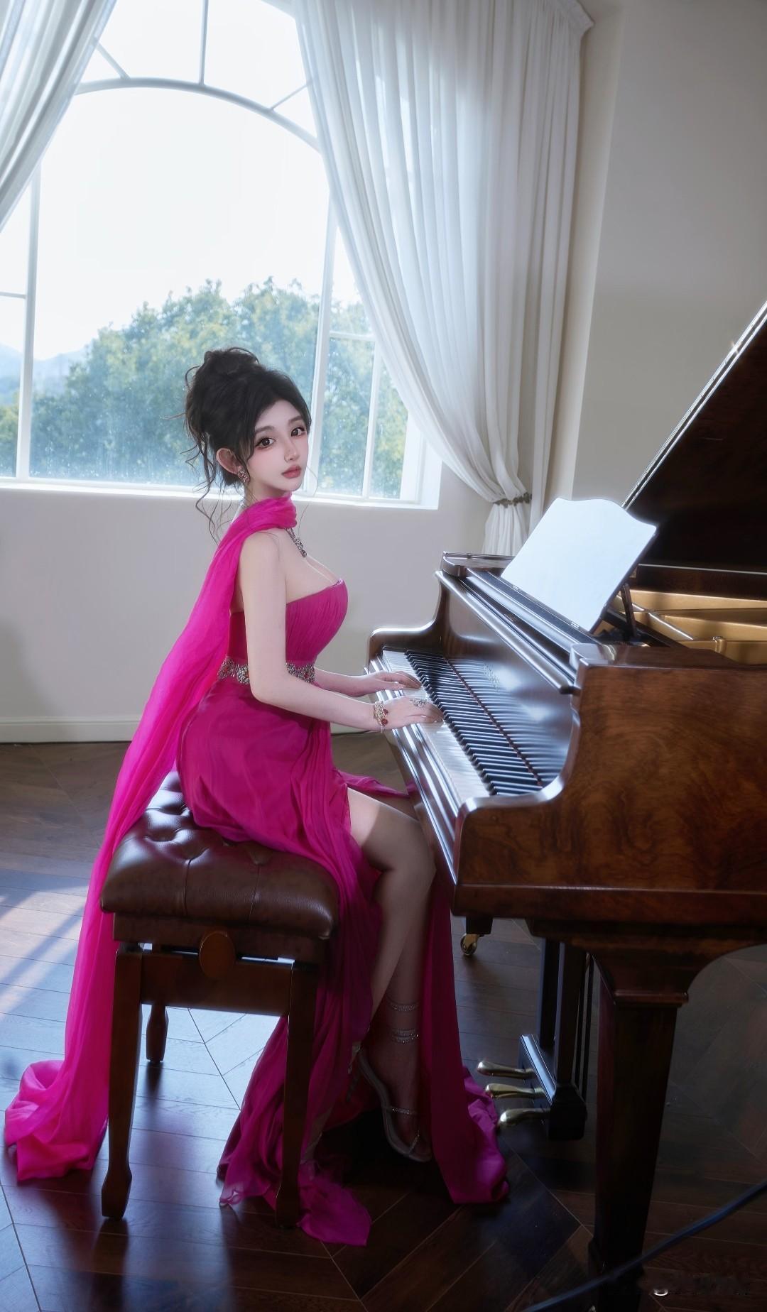 优雅钢琴女郎,粉色长裙飘逸,复古钢琴旁,梦幻氛围。