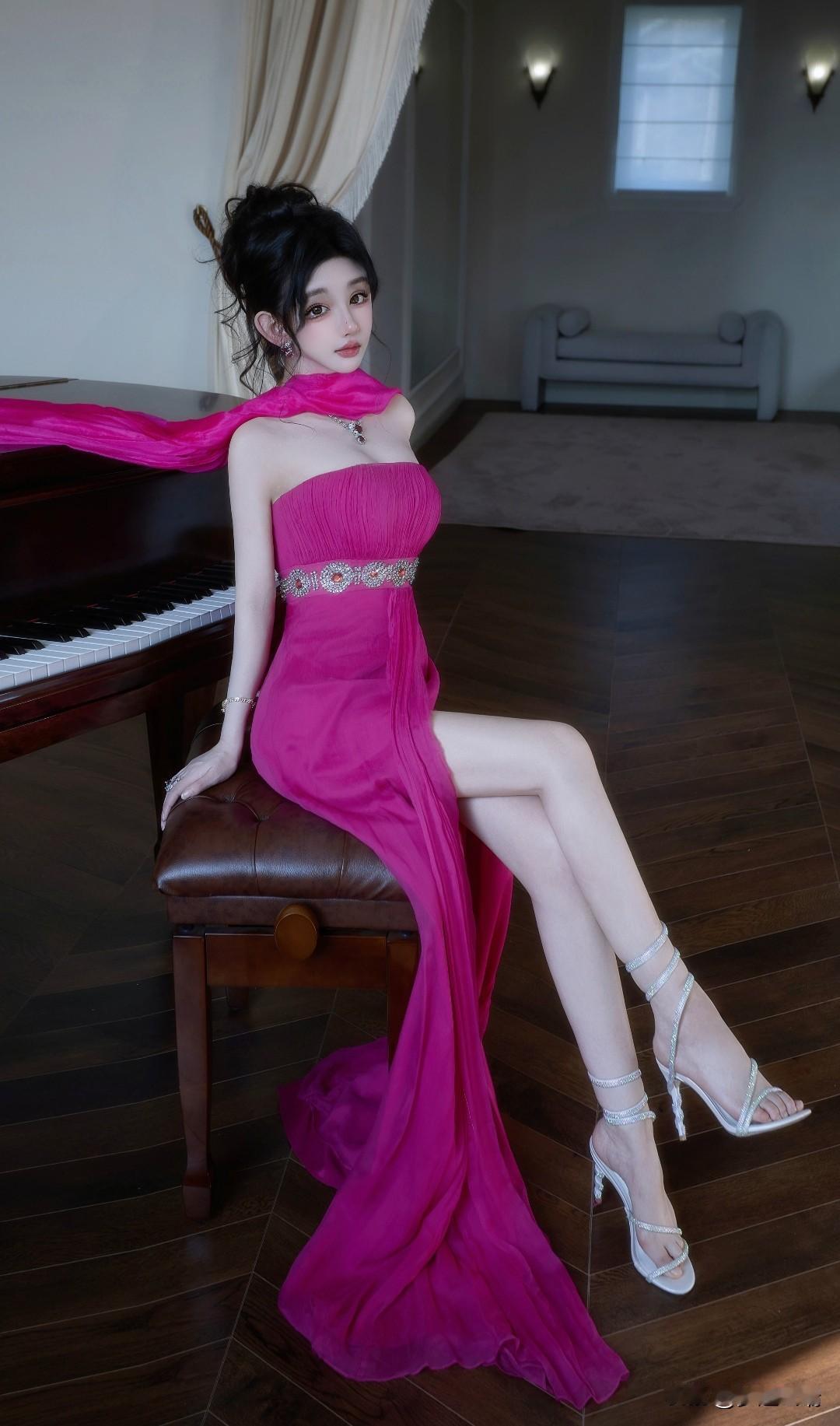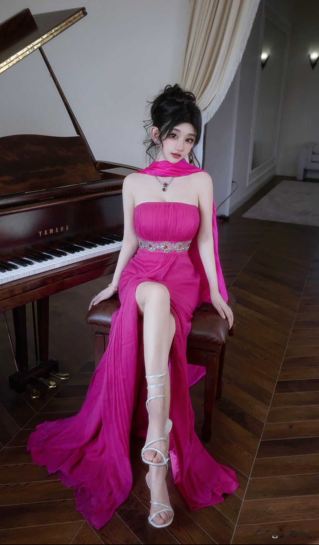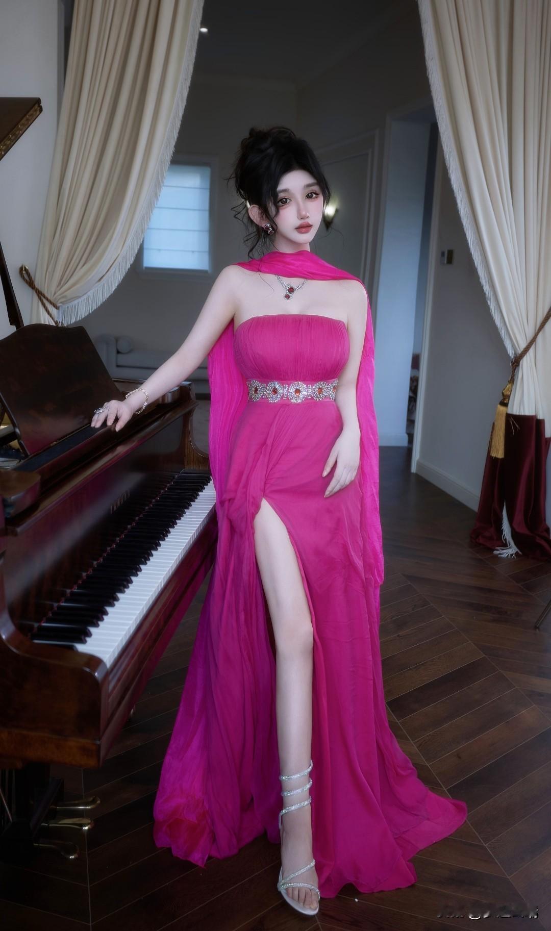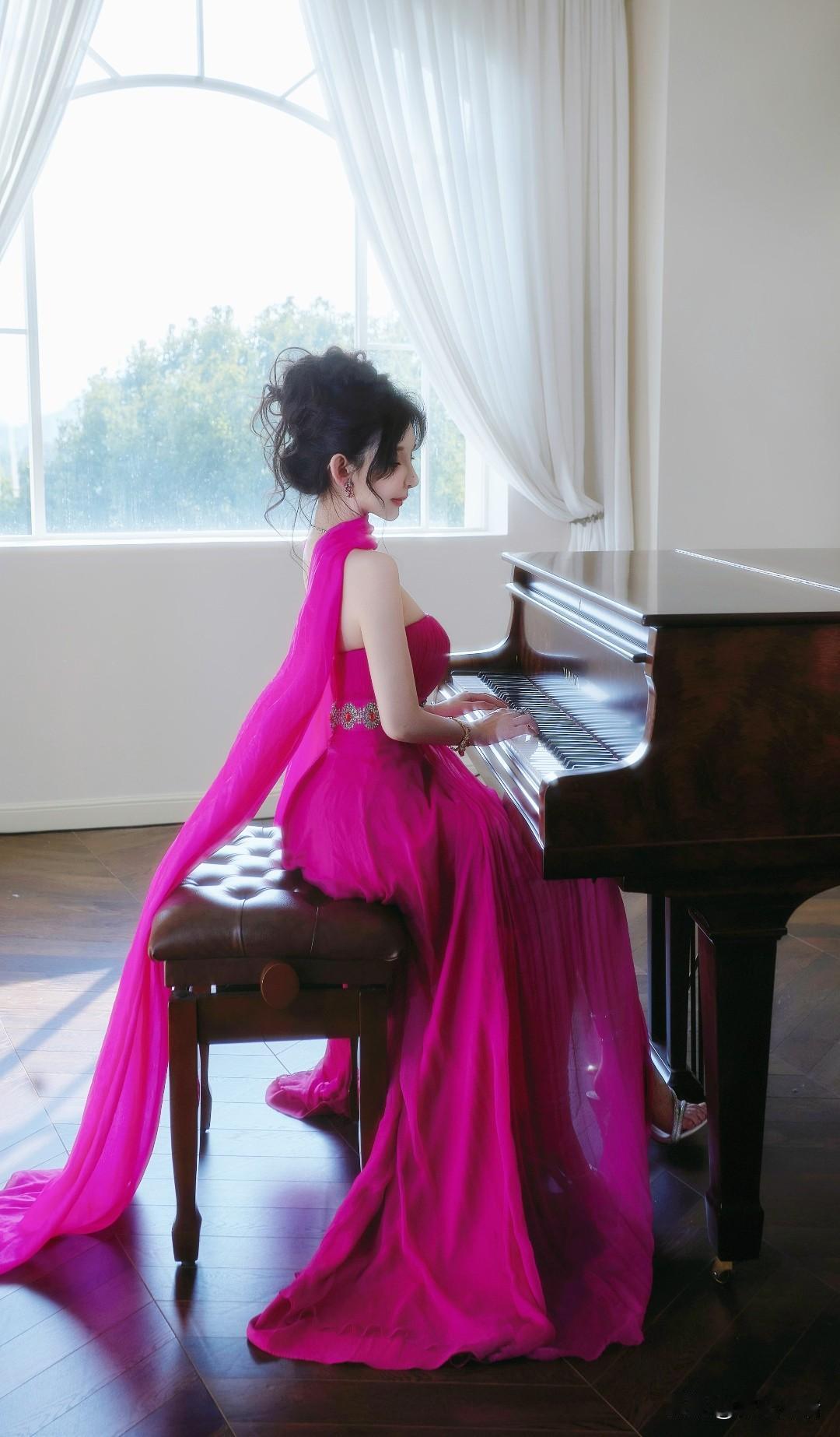 优雅钢琴女郎,粉色长裙飘逸,复古钢琴旁,梦幻氛围。