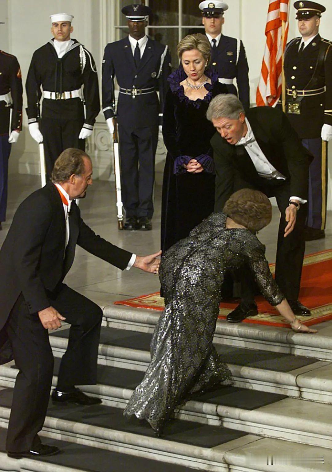 一张照片,四人神情各异,照片还是抓拍的经典。克林顿嘴巴张大看起来有点小惊讶,希拉里嘴巴有点小歪一如既往的淡定自若,还有一男子帮忙扶人。