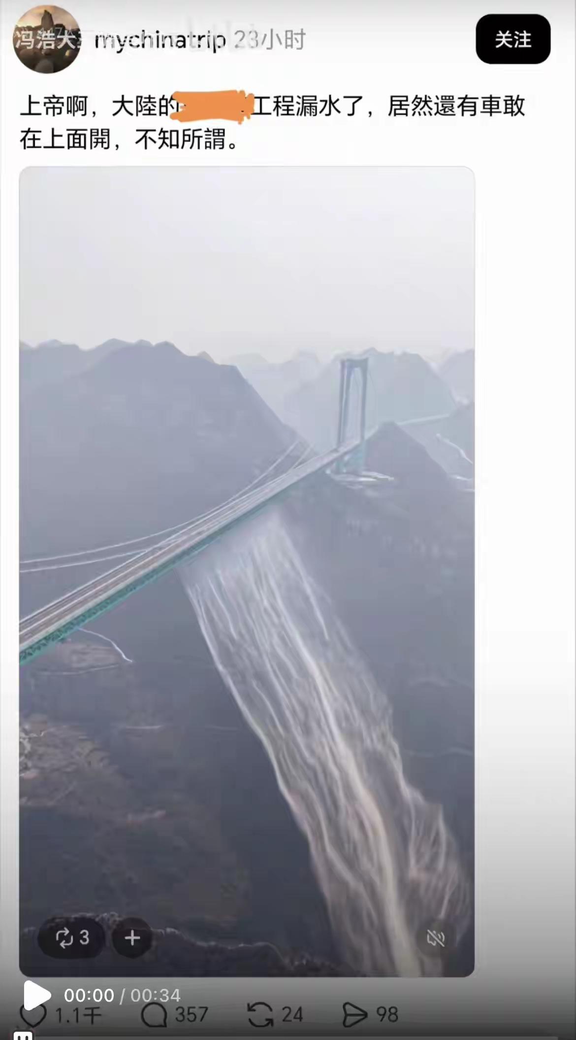 总有人说,容易被对岸的人拉低整体智商水平。 我以前不信,现在我是真的信了。 这就是不懂装懂的典型案例。 这个桥要是不漏水的话,估计下一场大雨就能直接能把桥给压塌了。 连这种简单的道理都理解不了,智商真的不高啊!