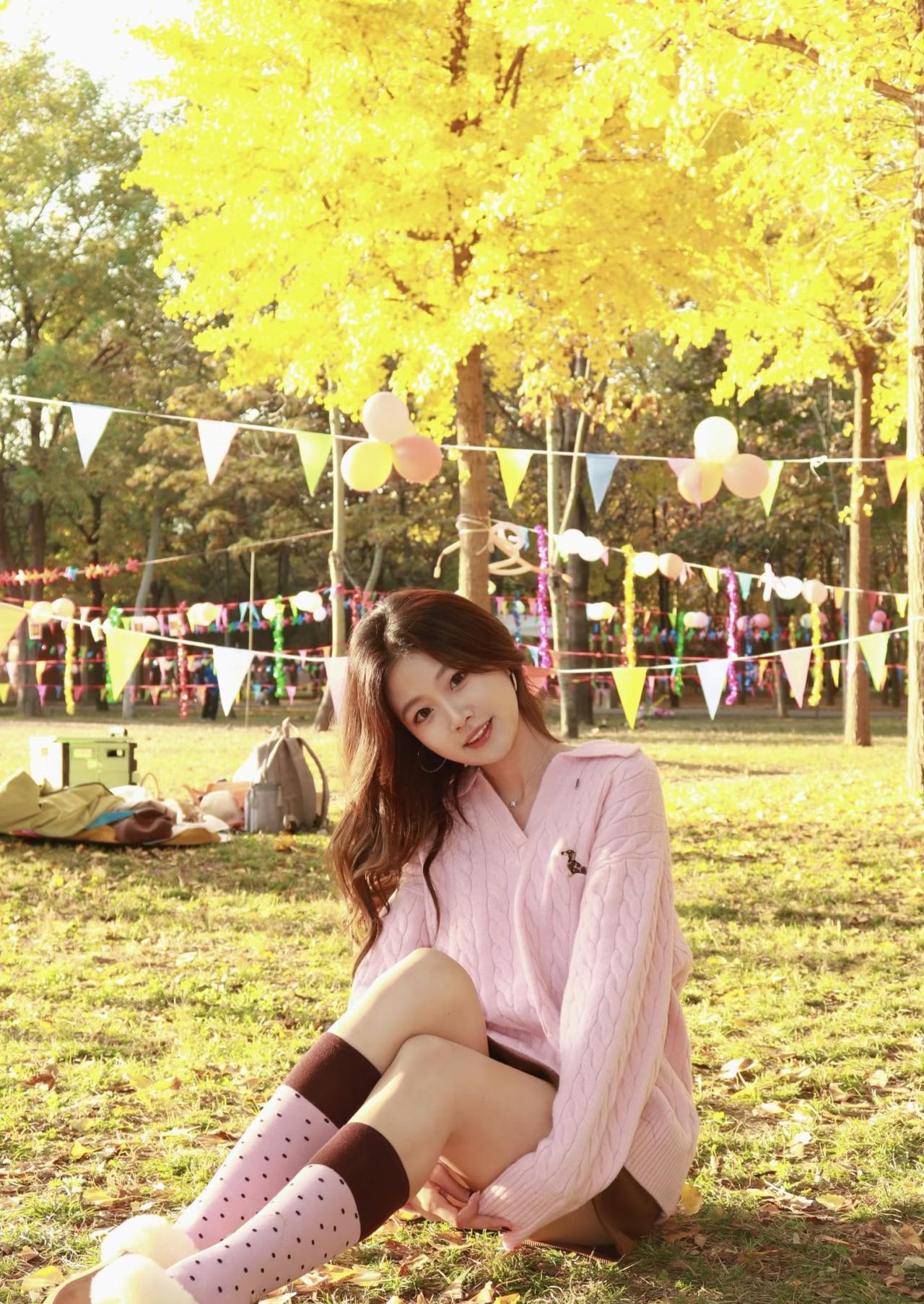 在满是金黄银杏的公园里,把日子过成诗。 粉色毛衣裹着秋日的暖意,波点长袜和毛