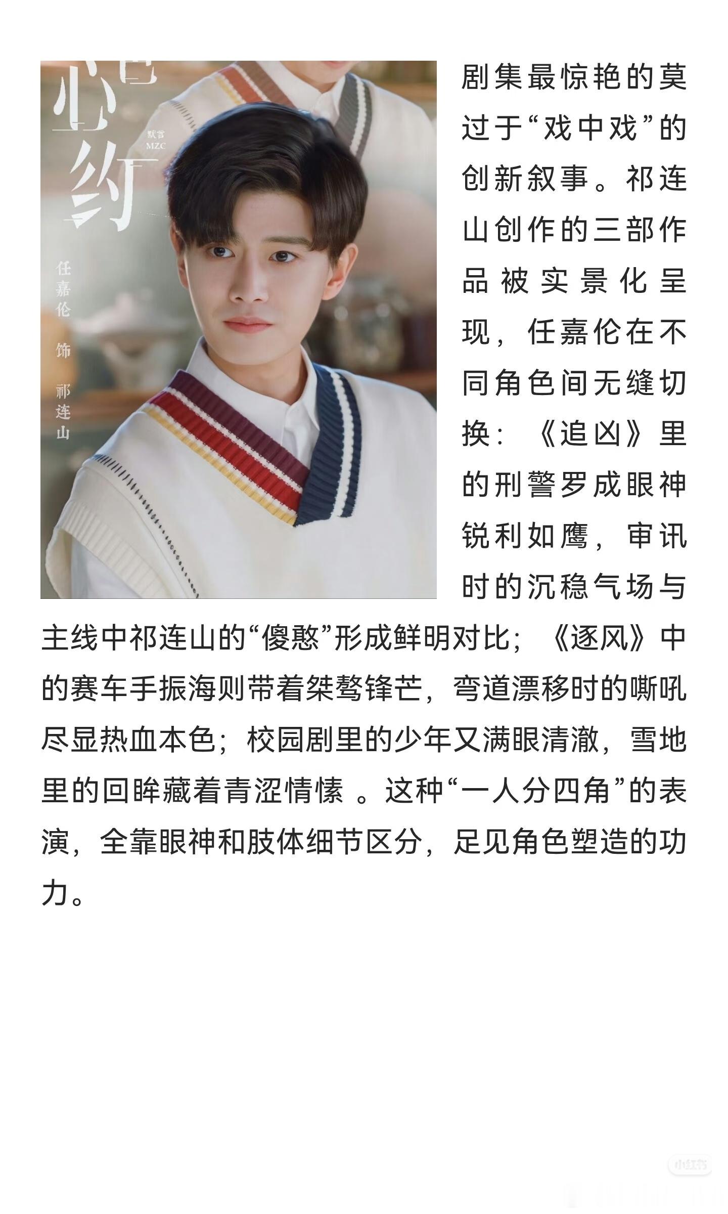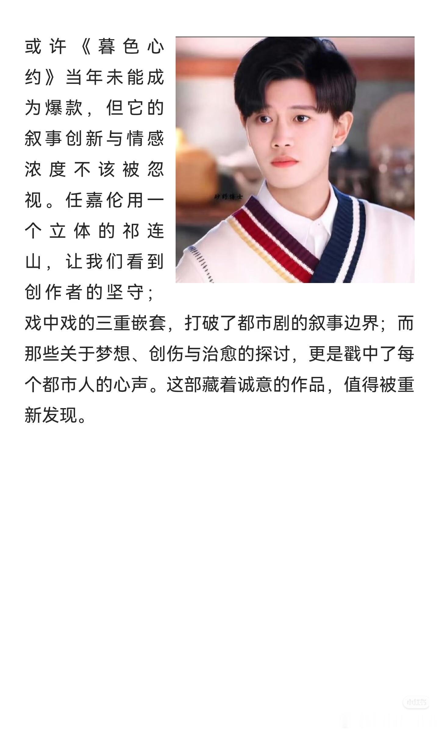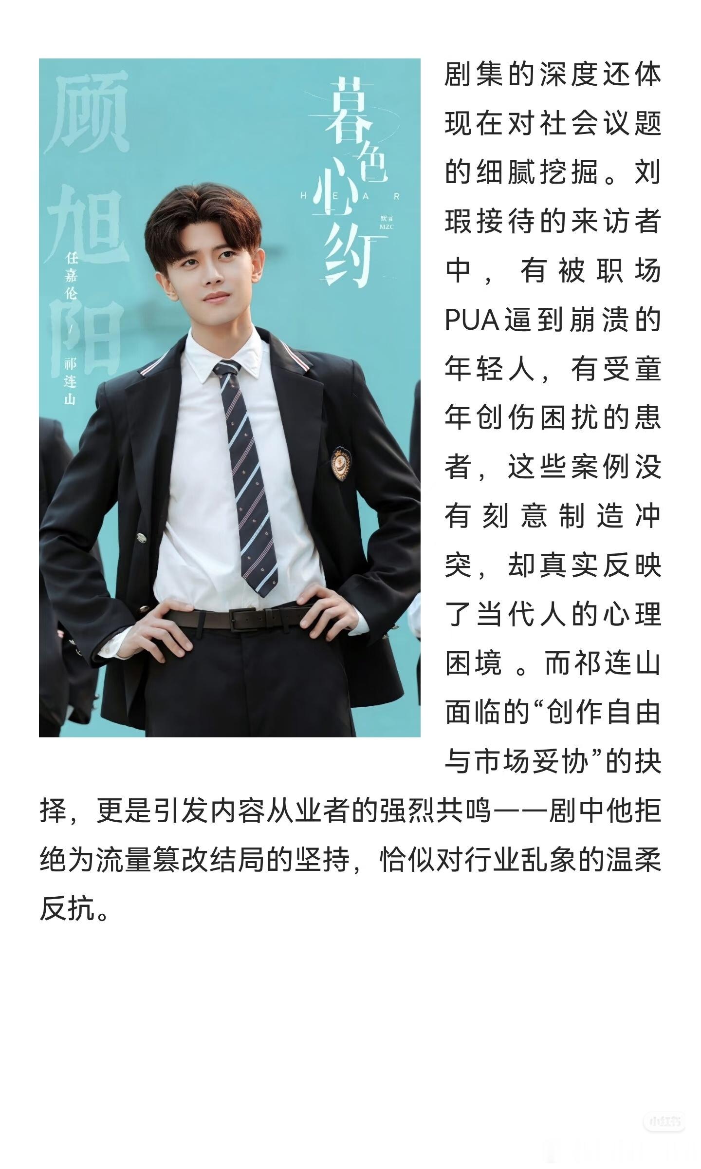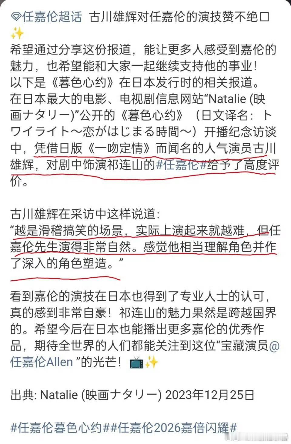 据媒体报道,古川雄辉对任嘉伦在《暮色心约》里面的演技赞不绝口,他那句点评“越是滑稽搞笑的场景,实际上演起来越难,但任嘉伦先生演得非常自然。感觉他相当理解角色并作了深入的角色塑造。”