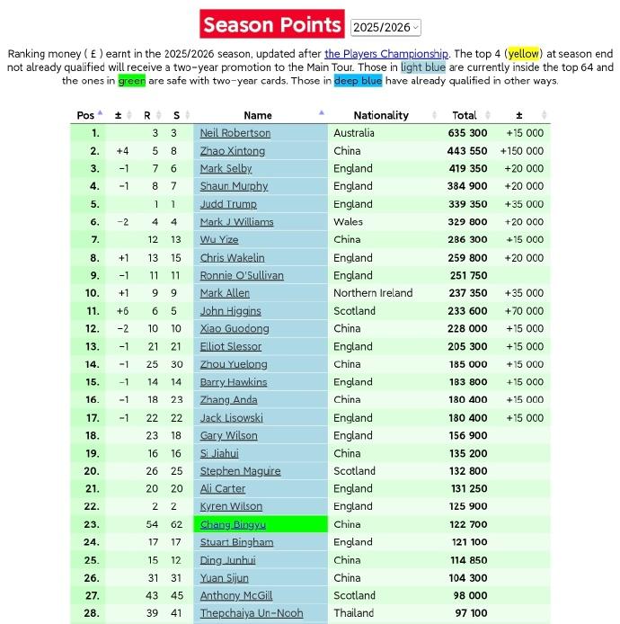 斯诺克:2026球员锦标赛赛后最新世界排名+单赛季排名 世界排名: 凭借在球员锦标赛背靠背夺冠,赵心童收获15万英镑奖金,世界排名上升到第5位,超越此前自己在2022年的职业生涯最高排名(第6位),再创新高! 亚军希金斯赛后第6位。 中国球员方面,肖国栋第10、吴宜泽第12、丁俊晖下滑两位到第15, 斯佳辉第16,张安达第18,周跃龙第25,庞俊旭第27,雷佩凡第29,袁思俊第31。 单赛季排名: 凭借15万英镑冠军奖金,赵心童单赛季排名上升到第2位,几乎锁定巡回锦标赛前4种子位! 希金斯则上升到赛季第11,大概率也能参加巡回锦标赛!肖国栋下滑到赛季第12,参赛资格有些危险!