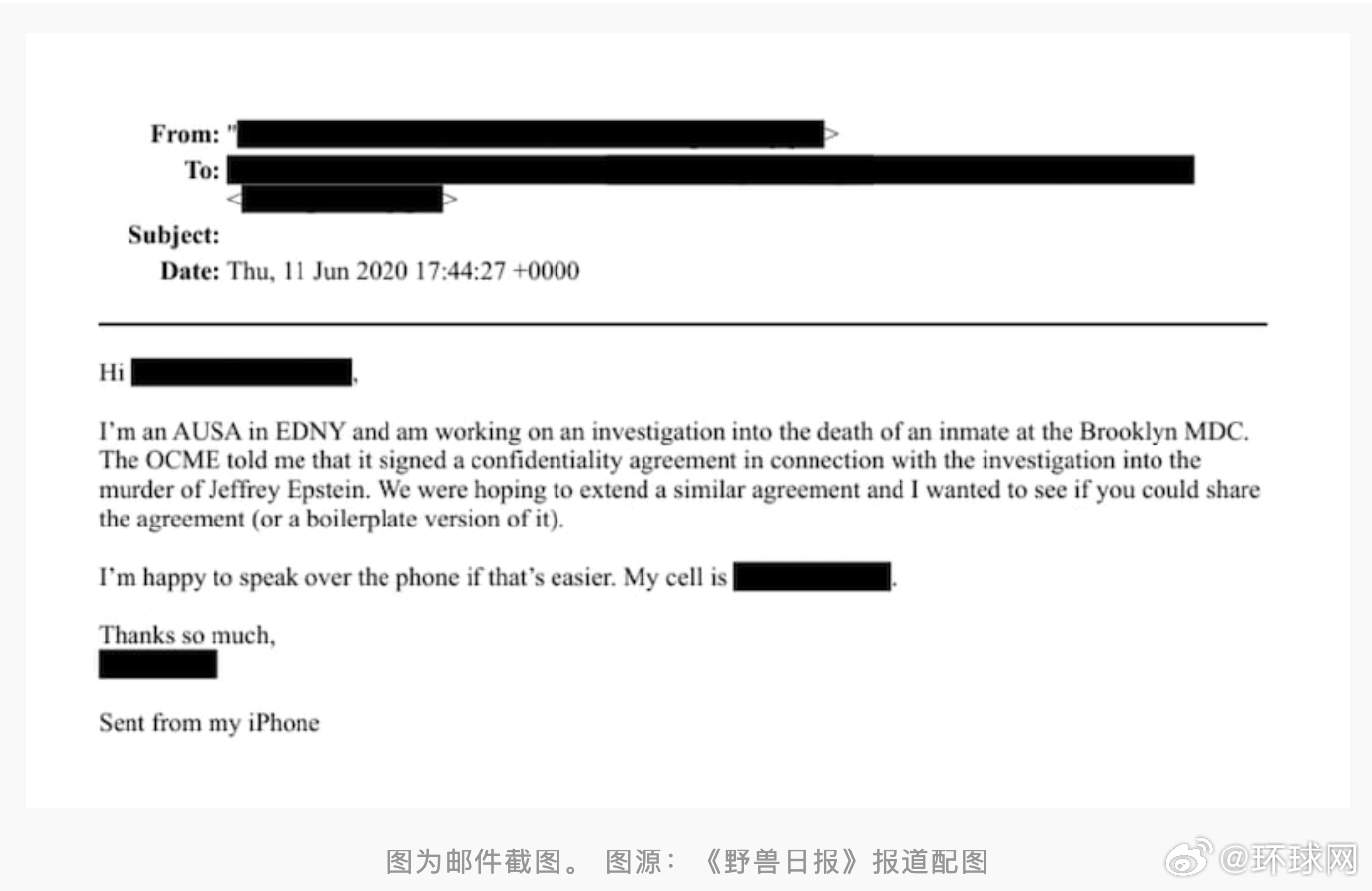 “OCME告诉我,他们就杰弗里·爱泼斯坦谋杀案调查签署了一份保密协议。”该邮件中写道。《野兽日报》称,OCME很可能是“首席法医办公室”的缩写。报道还称,这封邮件似乎暗示,在官方判定并宣布爱泼斯坦死于“自杀”之后很长一段时间里,他的死因可能一直被作为“谋杀案”进行调查。