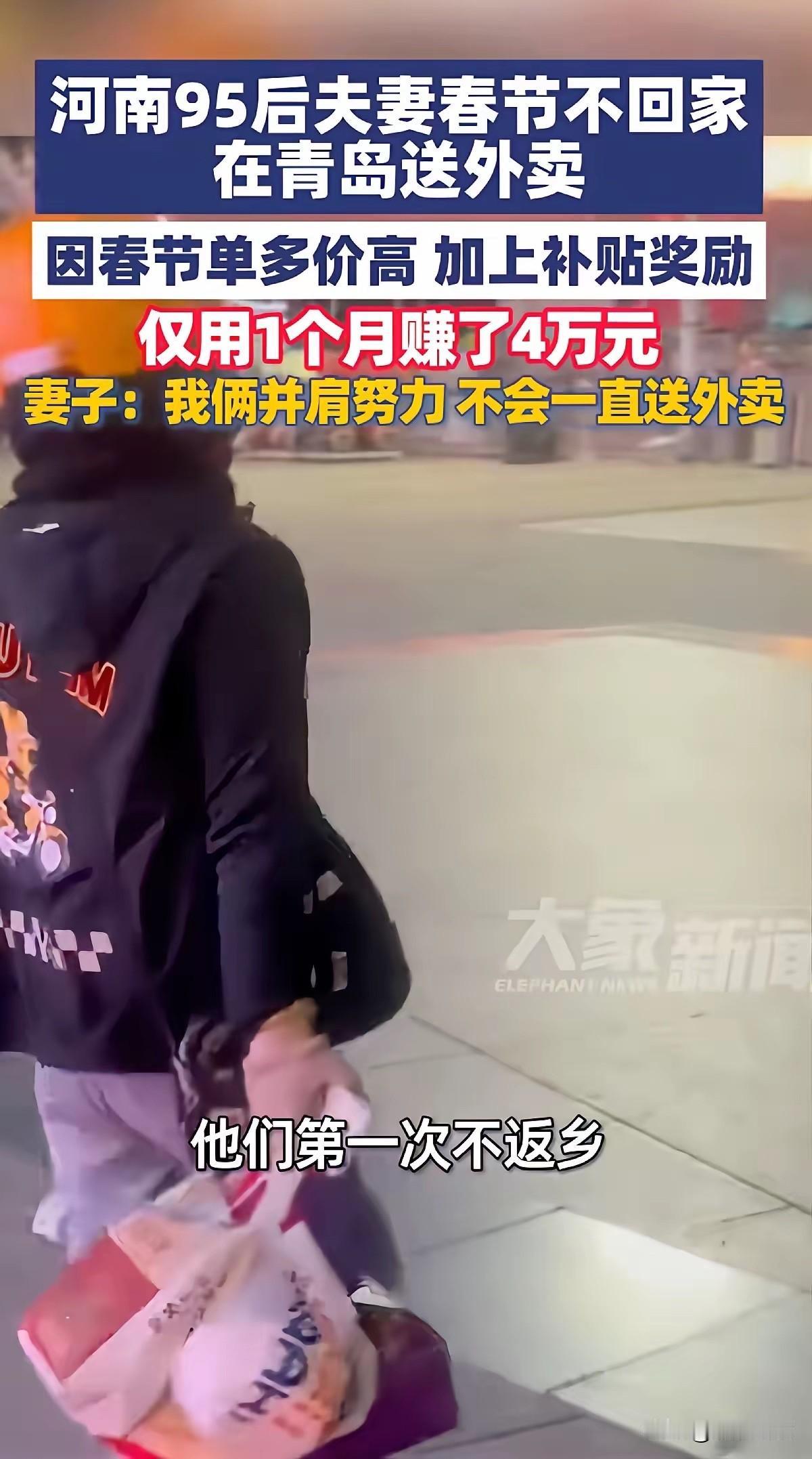 河南“95后”夫妻春节在青岛送外卖,1个月赚了近4万:因创业负债20万,债会一笔笔还清,陪伴彼此跑下去,坚信日子会越来越好。为了还债,2026年春节,他们将俩孩子送回老家,自己选择留在青岛。这也是他俩第一次春节不回老家。 春节期间青岛外卖配送费上浮约50%,平台还发放留岗奖励,夫妻俩合计拿到1.5万元补贴,高收入全靠特殊时段的政策红利支撑。 他们不是轻松躺赚,而是夫妻接力跑单,日均工作超12小时,寒风里穿梭在街头巷尾,每一分钱都浸透汗水与疲惫。 创业失败让他们背上20万债务,两个孩子年幼要养,生活没有退路,只能抓住春节增收的机会,用体力硬扛生活重压。 除夕夜别人阖家团圆吃年夜饭,他们还在送单路上,只能抽空给老家孩子发视频,短短几句问候,藏着说不尽的亏欠。 很多网友只看到月入近4万的数字,却忽略背后的牺牲,团圆被暂时放下,陪伴被压缩,青春被债务推着不停奔跑。 外卖行业数据显示,高龄骑手普遍存在关节劳损、肠胃问题,长期高强度奔波,会给身体留下难以逆转的健康隐患。 他们清醒知道送外卖不是长久之计,眼下只是过渡,每一笔收入都记在还债账本上,靠彼此支撑,一步步走出困境。 普通人的翻身从没有捷径,没有天降好运,只有咬牙坚持,用最朴素的努力,把负债的日子慢慢过成有光的模样。 这对夫妻的经历戳中无数普通人,生活再难,不躺平、不抱怨,夫妻同心往前冲,就是最硬核的生活态度。 各位读者你们怎么看?欢迎在评论区讨论。
