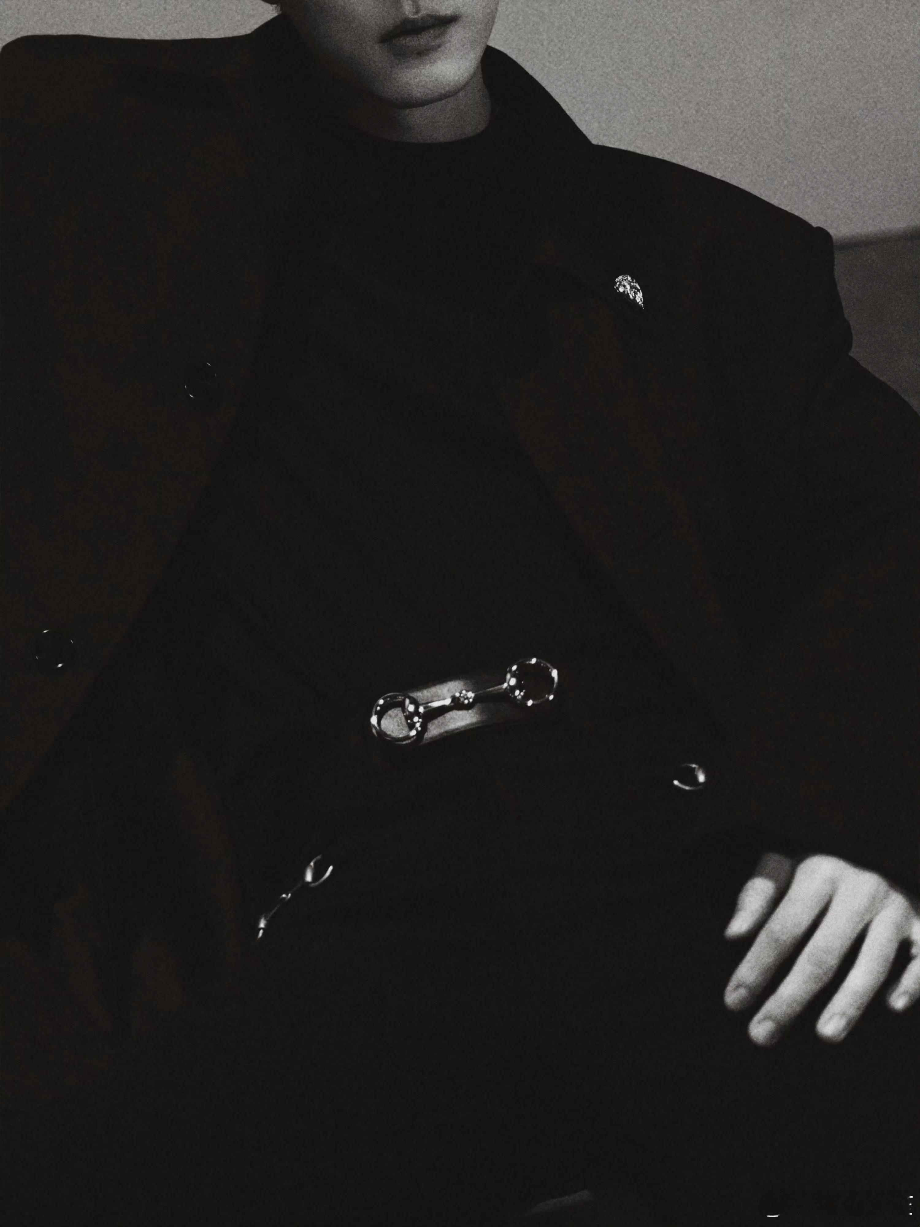 肖战的米兰时装周出发AllBlack造型:暗纹老花风衣,搭配抢眼的马衔扣装饰腰