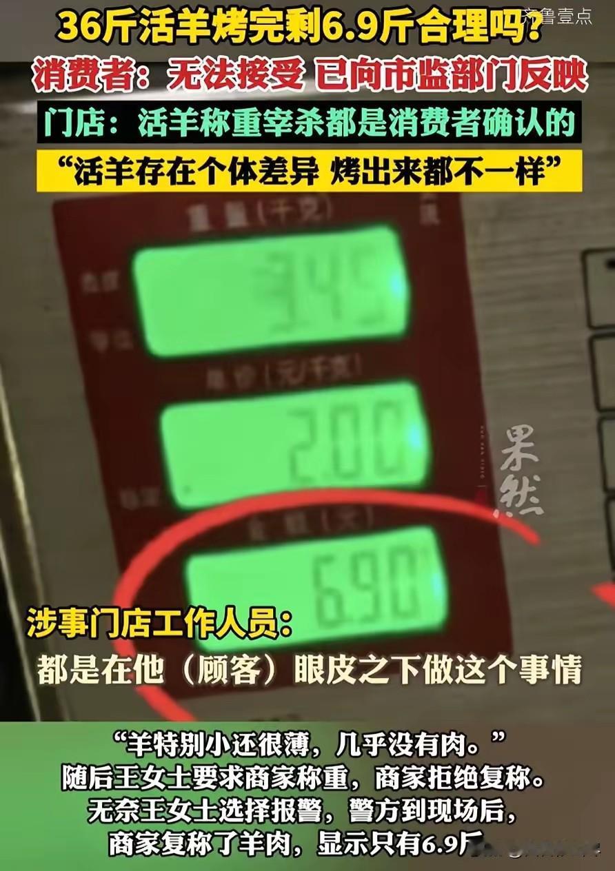 “这就太过分了!”重庆,女子一家人除夕夜没有在家做饭,而是到饭店花1188元点了一个烤全羊套餐,没成想,36斤的活羊烤完后就剩下6.9斤,女子当场报警,可店家却说:这是正常的! 重庆有位王女士,除夕夜一家人没在家做饭,想着过年图个省心,就去南滨路一家烤全羊店,花1188元点了一个烤全羊套餐,店家当时就当着他们的面,称了一只活羊,重量是36斤,还说现杀现烤,保证新鲜实在,王女士一家人看着活羊分量足,也挺期待这顿年夜饭。 等了几个小时,烤全羊端上桌的时候,王女士一下子就愣了,这烤好的羊看着特别小,薄薄的一层,几乎没多少肉,看着就不对劲。 她当即就跟店家说,这羊不对,36斤的活羊,怎么烤完就这么一点,要求店家复称,可店家却态度敷衍,说烤全羊缩水是正常的,行业里都这样,还说一般能剩下四成重量就不错了,拒绝给她复称。 王女士越想越生气,1188元不是小数目,过年一家人吃顿好的,结果遇到这种事,店家还拒不配合,她实在咽不下这口气,当场就拨打了110报警。 民警赶到现场后,就要求店家必须复称,店家没办法,才极不情愿地拿出电子秤,把烤好的全羊放上去,所有人都盯着秤上的数字,最后停在6.9斤,连7斤都不到。 看到这个数字,王女士气得手都抖了,36斤的活羊,烤完就剩6.9斤,这差距也太大了,可店家还是嘴硬,说这是正常的。 店家解释说,活羊和活羊不一样,有的羊喜欢运动,肉质紧,烤出来就显小、重量轻,有的羊不爱动就肥一点,还说这只羊烤得比较干,水分和油脂流失得多,所以重量才这么轻。 其实大家都能理解,活羊烤完确实会减重,毕竟宰杀的时候,要去掉羊毛、羊皮、羊头、羊蹄、内脏,还要放掉血液,这些都是不能吃的部分,肯定会减少一部分重量。 而且高温炭火烤几个小时,羊肉里的水分和油脂会大量蒸发、融化滴落,重量还会再减,但再怎么减,也不可能减到这么离谱。 按照正常的行业标准,36斤的活羊,宰杀清理完之后,去掉那些不能吃的部分,剩下的带骨生羊肉,正常应该在16到18斤之间,就算是偏瘦的羊,也不会偏离这个范围太多。 然后生羊肉烤完之后,重量还会再减,正常情况下,能剩下生羊肉重量的60%到70%,也就是说,36斤活羊,烤完之后的成品重量,正常应该在10到13斤之间,就算烤得再干,极限也不会低于8 斤。 可这家店的烤全羊,只有6.9斤,仅占活羊重量的不到两成,远远低于正常损耗范围,这根本不是什么正常缩水,就是店家在耍猫腻。 店家说的羊爱运动,就是瞎编的借口,说白了,要么是当初给活羊称重的时候,用了不准的秤,虚报了斤数,根本没有36斤;要么是宰杀的时候,偷偷把大羊换成了小羊,用小羊冒充36斤的大羊,最后再用 “正常损耗” 当遮羞布,糊弄消费者。 更让人不舒服的是,店家一开始还拒绝复称,要是真的没问题,真的是正常损耗,为什么不敢配合称重,非要等民警来了才肯复称,这明显就是心里有鬼,知道自己理亏。 王女士之所以报警,也不是小题大做,过年花了钱,想吃顿实在的,结果被店家这么糊弄,换谁都得生气,而且1188元,对于普通家庭来说,也不是一笔小钱,不能就这么不明不白地花了。 这件事被王女士发到网上之后,很多网友都有类似的遭遇,有人说吃活鱼被换成死鱼,有人说吃螃蟹被换成空壳,都是商家利用消费者不懂食材损耗,故意缺斤短两。 现在王女士已经向属地的市场监管部门反映了这件事,还在等着主管部门介入调解,希望能得到一个合理的说法。 其实这件事也给大家提了个醒,以后去吃现杀现烤的烤全羊,一定要全程盯着,活羊称重的时候,最好自己用手机再复称一下,保留好证据,宰杀和烤制的时候,也尽量盯着,避免商家偷换食材。 要是遇到店家拒绝复称,或者成品重量离谱的情况,别犹豫,直接报警或者向市场监管部门投诉,维护自己的合法权益,不能让这些不诚信的商家,拿着消费者的信任赚钱,更不能让他们用 “正常损耗” 的借口,掩盖自己缺斤短两的行为。 现在很多人都远离农业生产,不懂活羊宰杀和烤制的损耗,商家就是抓住了这一点,故意糊弄人,但损耗再多,也有个合理范围,36斤变6.9斤,从来都不是正常损耗,而是商家的诚信 “缩水” 了。 餐饮行业,讲究的就是诚信经营,靠耍小聪明、坑骗消费者,就算能赚一时的钱,终究也走不长远,而且还要承担相应的责任。