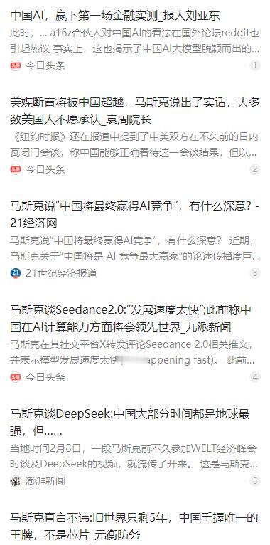 马斯克突然改口震碎西方认知!中国 AI 不是崛起是归位,DeepSeek 撕开技术垄断遮羞布 麻烦看官老爷们右上角点击一下“关注”,既方便您进行讨论和分享,又能给您带来不一样的参与感,感谢您的支持! 2026 年开年,全球科技界迎来一场认知转向,埃隆・马斯克在公开访谈中对中国人工智能发展做出全新判断,打破了西方长期以来的固有认知。他不再简单用 “崛起” 形容中国 AI,而是从历史与产业规律角度,重新定义中国在智能科技领域的位置。 在他看来,中国人工智能的快速进步,并非突然的弯道超车,而是依托完整工业体系、海量应用场景与持续投入带来的必然回归。这一表述虽未直接使用 “归位” 一词,却传递出相近内核,让西方舆论重新审视中国科技发展的底层逻辑。 访谈中,马斯克多次提及中国 AI 领域的代表性成果,其中就包括在全球开源社区引发震动的 DeepSeek 系列模型。这款由中国团队自主研发的大模型,凭借架构创新与工程优化,在性能比肩国际顶尖水平的同时,把训练与推理成本降到传统方案的几分之一。 DeepSeek 坚持全面开源路线,开放核心代码与技术方案,让全球开发者都能低成本使用、二次开发与商业落地。这种开放普惠的模式,直接冲击了西方少数企业依靠技术封闭形成的垄断格局,也让 AI 技术从少数巨头的专属资源,变成普惠全球的公共能力。 开源带来的生态效应快速显现,全球开发者基于 DeepSeek 搭建的工具、应用与垂直模型持续增长,覆盖科研、教育、工业、办公等众多场景。大量中小团队与科研机构借助这套低成本方案,快速实现 AI 能力落地,形成生机勃勃的创新生态。 2025 年,中国人工智能产业进入规模化出海阶段,相关软件与服务出口保持高速增长,海外订单持续攀升。中国 AI 不再局限于本土市场,而是凭借性价比、稳定性与场景适配能力,在全球数字服务贸易中占据越来越重要的份额。 从技术突破到商业落地,中国 AI 走出了一条区别于西方的路径。西方模式更强调实验室领先与技术封闭,中国则立足产业需求,以工程化、低成本、全链条协同的方式推进,让技术更快走进现实,形成可持续的商业闭环。 马斯克在访谈中重点强调,电力将是 AI 时代最核心的资源,算力竞争本质上是能源供给能力的竞争。他预测,按照当前趋势,中国的发电总量有望达到美国的三倍左右,这会成为中国在全球 AI 算力竞赛中的决定性优势。 这一判断直指全球 AI 发展的共同瓶颈。大模型训练与推理需要持续稳定的巨量电力,美国多地已出现算力中心缺电、限电、审批周期过长的问题,而中国依托完善的能源基建与特高压网络,能稳定支撑大规模算力集群运行。 中国 “东数西算” 工程与能源布局高度协同,把西部清洁能源优势转化为东部数字经济发展动力,实现算力、数据、能源的最优配置。这种国家级统筹能力,让中国在 AI 基础设施建设上形成系统性优势,难以被简单模仿。 从芯片、服务器、操作系统到大模型、应用开发,中国已构建起自主可控的 AI 全产业链。面对外部技术限制,国内企业加快替代步伐,在算力硬件、框架软件、模型训练等环节不断突破,保障产业安全与持续迭代。 产业链完整带来的不仅是安全,更是效率与成本优势。各个环节紧密配合、快速迭代,让新技术从实验室到生产线的周期大幅缩短,也让中国 AI 在全球竞争中保持强劲的性价比与落地能力。 DeepSeek 的崛起并非孤立事件,而是中国 AI 产业整体成熟的缩影。它证明中国完全有能力做出世界一流的原创 AI 技术,也有能力用开放生态推动全球 AI 普惠发展,改写由少数企业定义规则的旧格局。 西方社会对中国 AI 的认知正在快速转变,从最初的质疑、轻视,到警惕、限制,再到如今不得不承认其竞争力与系统性优势。马斯克的公开表态,正是这一认知转向的标志性信号。 中国 AI 的发展路径清晰可见:以自主创新为根基,以开源开放为纽带,以能源与基建为底座,以产业落地为目标。它不追求短期噱头,而是立足长期主义,稳步提升技术实力与全球影响力。 未来,随着算力规模持续扩大、模型能力不断升级、应用场景持续深化,中国 AI 将在全球科技格局中扮演更重要的角色。这不是某一家企业、某一项技术的胜利,而是整个国家创新体系与产业生态的胜利。 从跟跑、并跑到逐步领跑,中国 AI 用实力证明,技术创新没有国界,更没有固定模式。只要坚持长期投入、尊重规律、开放合作,任何国家都能在智能时代找到属于自己的位置,为人类科技进步贡献力量。