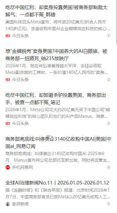 拿中国钱、用中国数据,转头140亿卖给美国!商务部制裁太解气 麻烦看官老爷们右上角点击一下“关注”,既方便您进行讨论和分享,又能给您带来不一样的参与感,感谢您的支持! 近年来,人工智能成为全球科技竞争的核心领域,不少中国 AI 企业依托国内市场、资本与数据快速成长,在国际舞台上崭露头角。 与此同时,部分企业在资本诱惑下动起歪心思,试图将在中国境内成长起来的核心技术,违规转让给境外企业,给国家科技安全与数据安全带来隐患。 在人工智能关键技术与数据资源已经成为国家战略资产的今天,任何试图绕开监管、违规转移核心技术的行为,都必然会受到严格约束。 近期就有一起典型案例引发广泛关注,一家从国内起步的人工智能企业,长期享受着国内创业政策、产业资本与海量应用数据的支持。 从早期研发到产品迭代,从团队搭建到市场拓展,这家企业的每一步成长,都离不开国内资源的持续投入,也离不开国内用户数据的训练支撑。 在技术逐渐成熟后,这家企业没有选择扎根国内、反哺产业链,反而盯上了境外巨头开出的高价收购方案,试图将核心技术打包出售。 为了顺利完成交易,这家企业开始刻意实施去中国化操作,通过变更注册地、转移核心资产、调整团队结构等方式,试图规避我国技术出口监管要求。 它一边裁撤国内研发与运营团队,淡化与中国市场的关联,一边加紧与境外收购方对接,企图在短时间内完成技术与资产的跨境转移。 按照双方计划,这笔交易作价约 20 亿美元,折合人民币接近 140 亿元,对于一家依靠国内资源成长起来的创业企业来说,无疑是巨大的短期利益诱惑。 但这种吃着中国红利、却要把核心成果卖给境外的做法,不仅伤害了国内投资者与用户的信任,更触碰了国家技术安全与数据安全的红线。 针对这一明显违规的跨境技术转让意图,我国商务部迅速启动合规评估与监管核查,明确指出该企业核心技术根源于国内研发积累。 依据我国技术出口管制、数据安全、网络安全等相关法律法规,这类涉及人工智能关键核心技术的跨境转让,必须严格履行技术出口审查程序。 监管部门在核查中确认,该企业的算法框架、训练数据、核心专利等,均形成于国内经营活动期间,属于受管制的关键技术范畴。 未经国家主管部门审查许可,任何企业不得擅自将这类技术转让给境外机构或个人,更不能通过转移主体等方式恶意规避监管。 商务部的监管动作,直接叫停了这起存在明显合规风险的收购交易,也向所有科技企业释放出清晰而坚定的信号:科技有国界,安全有底线。 人工智能关键技术,关系到国家产业链供应链安全,关系到海量用户的数据隐私保护,绝不是可以随意买卖的普通商品。 那些依托国内政策、资本、数据、人才成长起来的企业,理应承担起相应的社会责任与国家安全责任,而不是一有机会就想着 “远走高飞”。 从商业伦理来看,拿中国的钱、用中国的数据、享中国的市场,却在关键时刻把核心技术卖给境外竞争对手,本身就是忘本逐利的短视行为。 从国家利益来看,关键核心技术是国之重器,必须牢牢掌握在自己手里,任何试图违规外流的行为,都会受到法律的约束与市场的唾弃。 此次监管介入,不仅是对单一企业违规行为的纠正,更是对整个科技行业的一次深刻警示,让所有企业看清合规经营的重要性。 在全球科技竞争日趋激烈的背景下,我国既鼓励企业开展合法合规的跨国合作,也坚决守住技术安全与数据安全的底线不动摇。 技术出口审查不是阻碍开放,而是为了更好地保障国家核心利益,保障本土科技产业健康有序发展,保护广大用户的数据安全与合法权益。 对于企业而言,真正的长久竞争力,不是靠一次性出售技术换取短期收益,而是坚守合规底线、深耕本土市场、持续自主创新。 只有把核心技术掌握在自己手中,把安全责任扛在肩上,才能在国内外市场行稳致远,赢得用户、市场与国家的长期信任。 未来,随着我国技术出口管制与数据安全监管体系不断完善,类似试图违规转移核心技术的行为,将会受到更严密的监督与更严格的约束。 这起事件也为所有科技创业者敲响警钟:享受时代红利,就要承担时代责任;背靠国家资源,就要守护国家利益。 合规与安全,是企业走向世界的通行证,也是科技行业高质量发展的生命线。任何企业都不能心存侥幸,更不能触碰红线。
