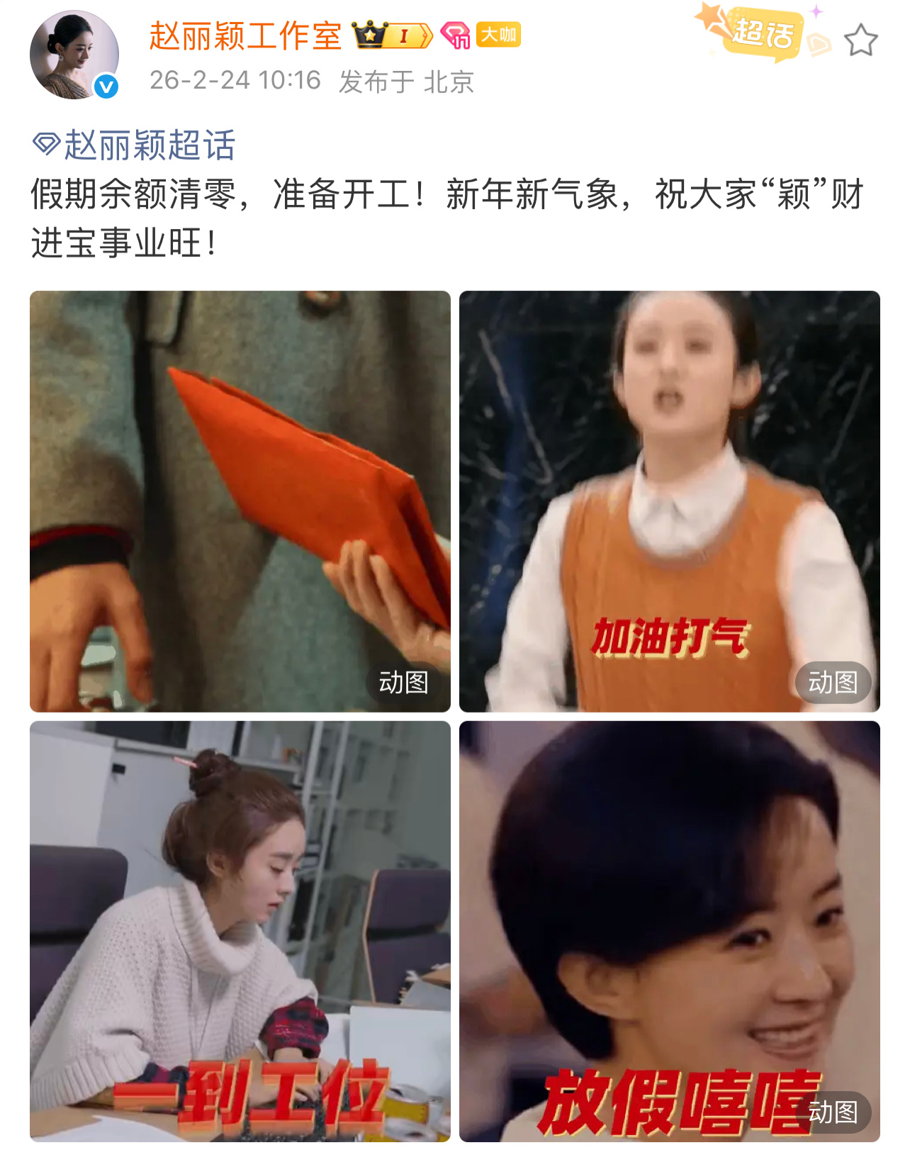 赵丽颖开工营业 赵丽颖开工营业,祝大家“颖”财进宝事业旺,开工大吉 开工大吉