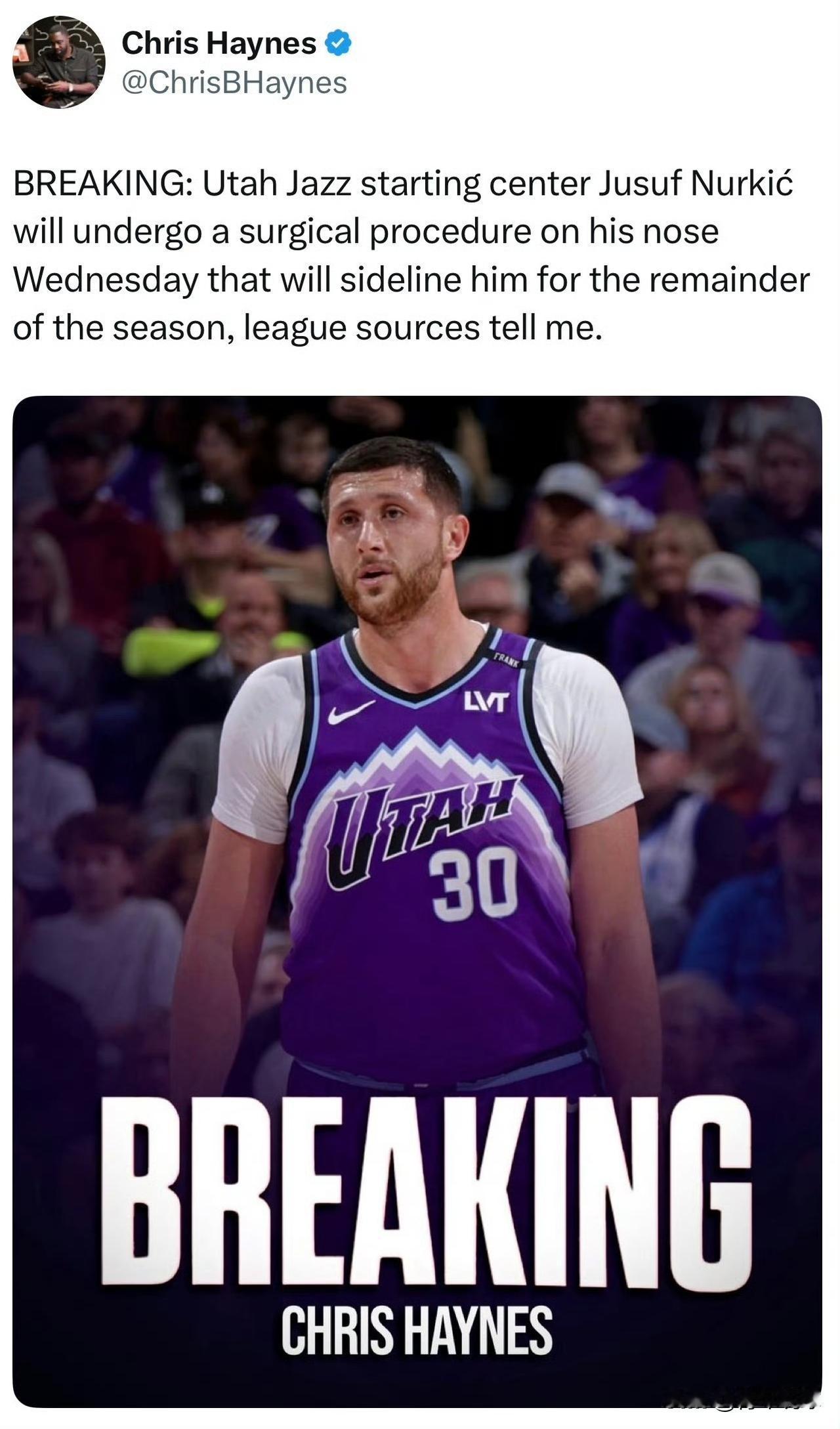 爵士队又一人赛季报销!肖华无奈了! 据权威记者Chris Haynes报道:爵士队主力中锋努尔基奇因鼻子做手术而赛季报销。这样一来,爵士队三大内线全部因伤导致赛季报销。 努尔基奇本赛季在爵士队打出了出色的表现,场均可以得到10.9分10.4篮板4.8助攻1.3抢断,数据非常全面。肖华真是欲哭无泪,刚刚宣布将对摆烂行为进行制裁,还将调整选秀规则,爵士队立马选择正面硬刚,将摆烂进行到底。这个时候由于鼻子做手术而赛季报销,真是闻所未闻,但联盟真还对此无可奈何!