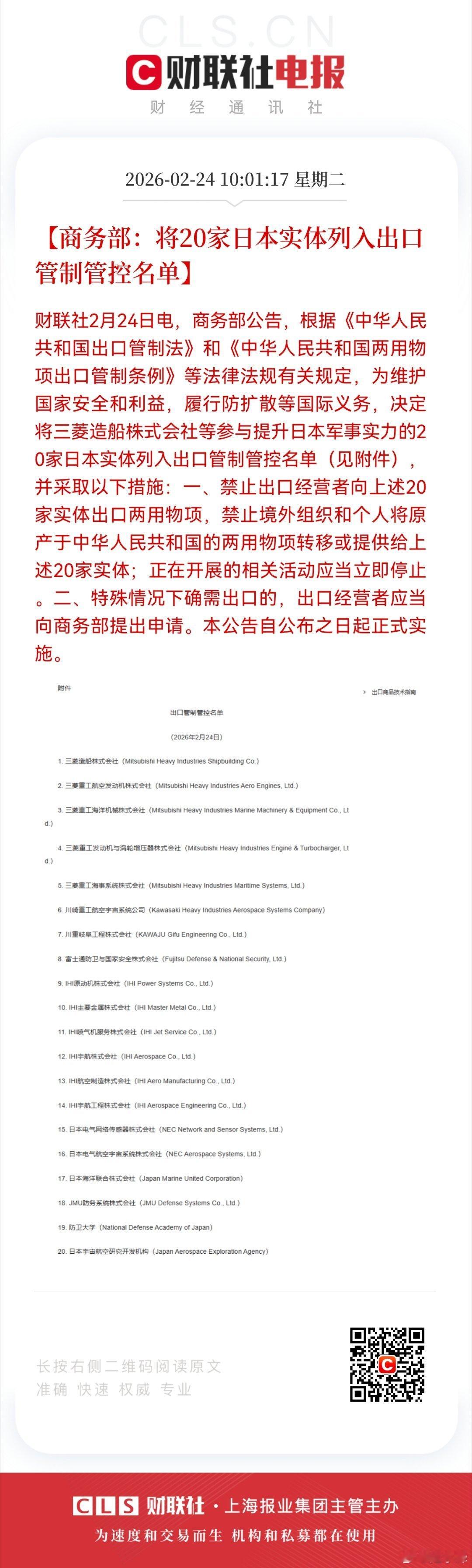 【商务部:将20家日本实体列入出口管制管控名单】财联社2月24日电,商务部公告,根据《中华人民共和国出口管制法》和《中华人民共和国两用物项出口管制条例》等法律法规有关规定,为维护国家安全和利益,履行防扩散等国际义务,决定将三菱造船株式会社等参与提升日本军事实力的20家日本实体列入出口管制管控名单(见附件),并采取以下措施:一、禁止出口经营者向上述20家实体出口两用物项,禁止境外组织和个人将原产于中华人民共和国的两用物项转移或提供给上述20家实体;正在开展的相关活动应当立即停止。二、特殊情况下确需出口的,出口经营者应当向商务部提出申请。本公告自公布之日起正式实施。