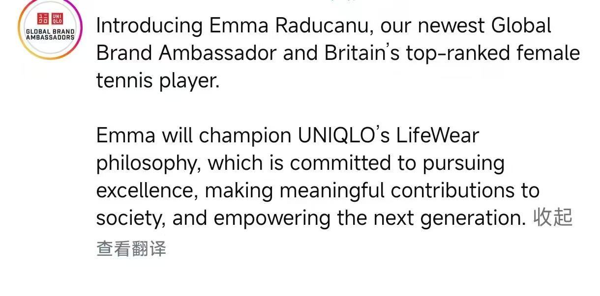 网坛风云 优衣库刚刚官宣:拉杜卡努成为新的全球品牌大使。