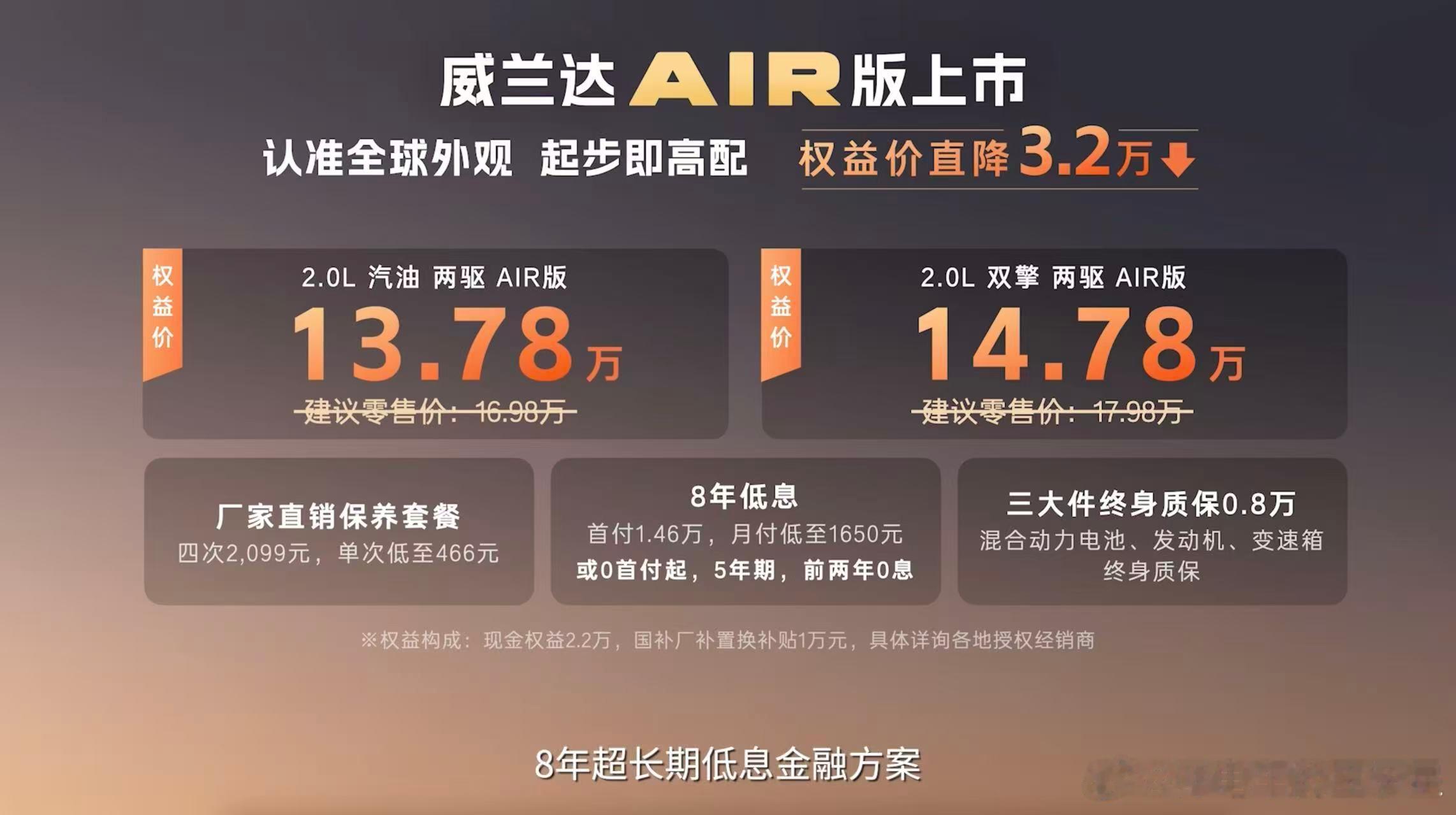 威兰达全球卖了多少,1500万台这个车型本来已经证明了消费者喜欢所以全新威兰达AIR 直接原版原汁原味北美硬派造型 可城市可越野, 13万的车哪里找