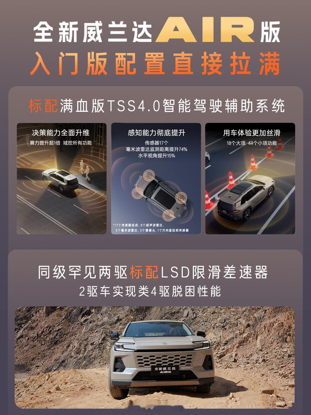广丰的油车大家有口皆碑从还凯美瑞到汉兰达那都是口碑爆炸全新的威兰达带着让人惊喜的价格来了厂补国补叠加优惠,权益价来到13.78万-14.78万,首次进入13万级,性价比很高威兰达AIR版上市13.78万起