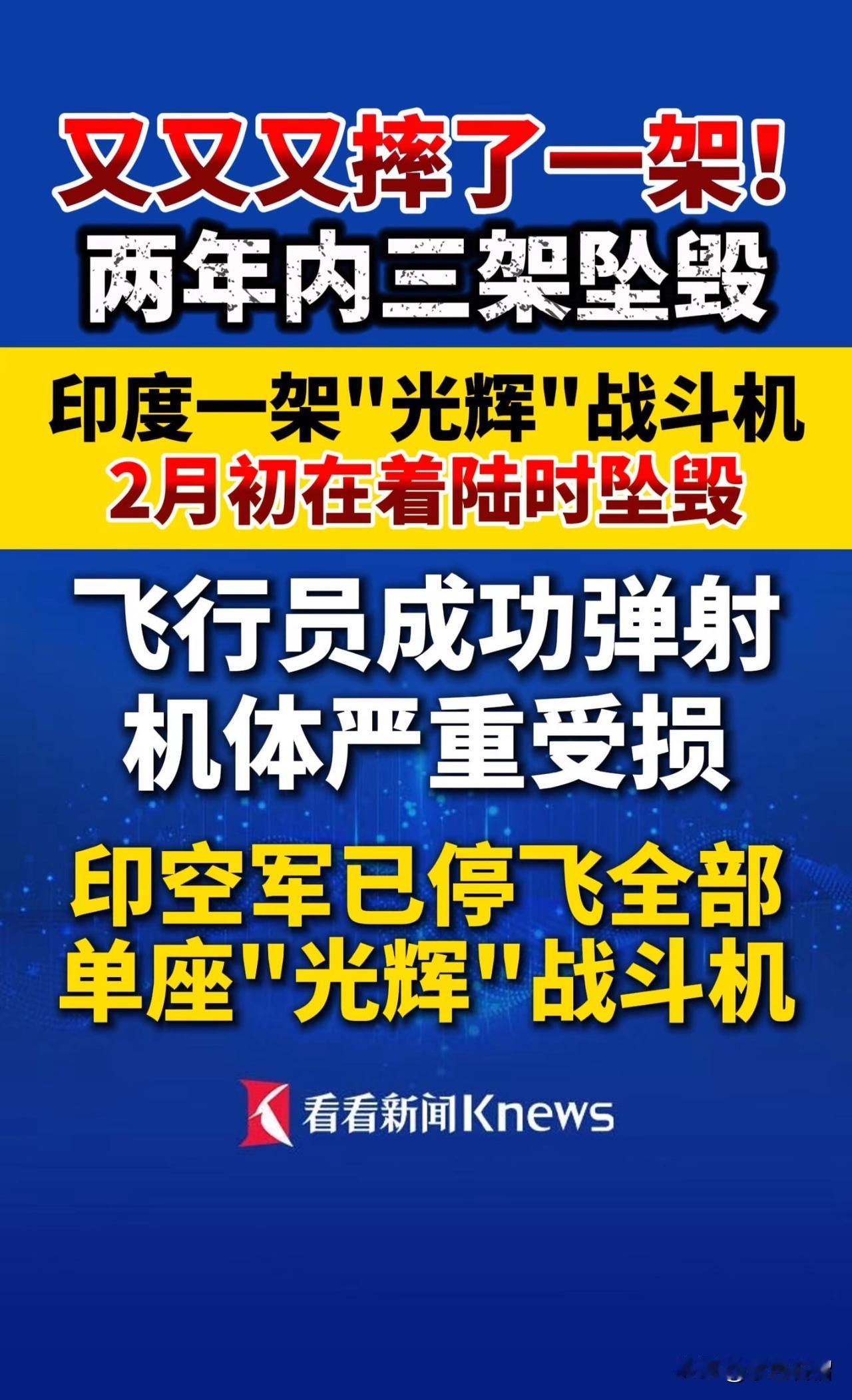 阿三又出大事了!“光辉”号战机再度坠毁!印度“光辉”号飞机又添“光辉”飞行记录! 据印度相关媒体报道,2026年2月7日,“光辉”号于印度某空军基地着陆时冲出跑道,战机严重受损。所幸飞行员弹射逃生。这已是“光辉”战斗机第三次坠毁,简直是拿飞行员的生命当儿戏! 算起来,这是“光辉”号两年内第三次坠毁了。第一次是在2024年3月,“光辉”号在印度本土演习训练时发动机故障,飞行员也是弹射逃生成功。 第二次就没这般幸运了。2025年11月21日,“光辉”号在迪拜航展上先是出现漏油情况,多到用塑料袋接,接着直接在飞行表演中失控坠毁,飞行员遇难。不得不说,那一次阿三把脸都丢到国外去了,还让一名飞行员无辜丧命! 据悉,印度空军目前已停飞所有“光辉”号战斗机。这个选择没错,没有先进技术支撑,就别打肿脸充胖子,不然丢的只能是自己的脸!