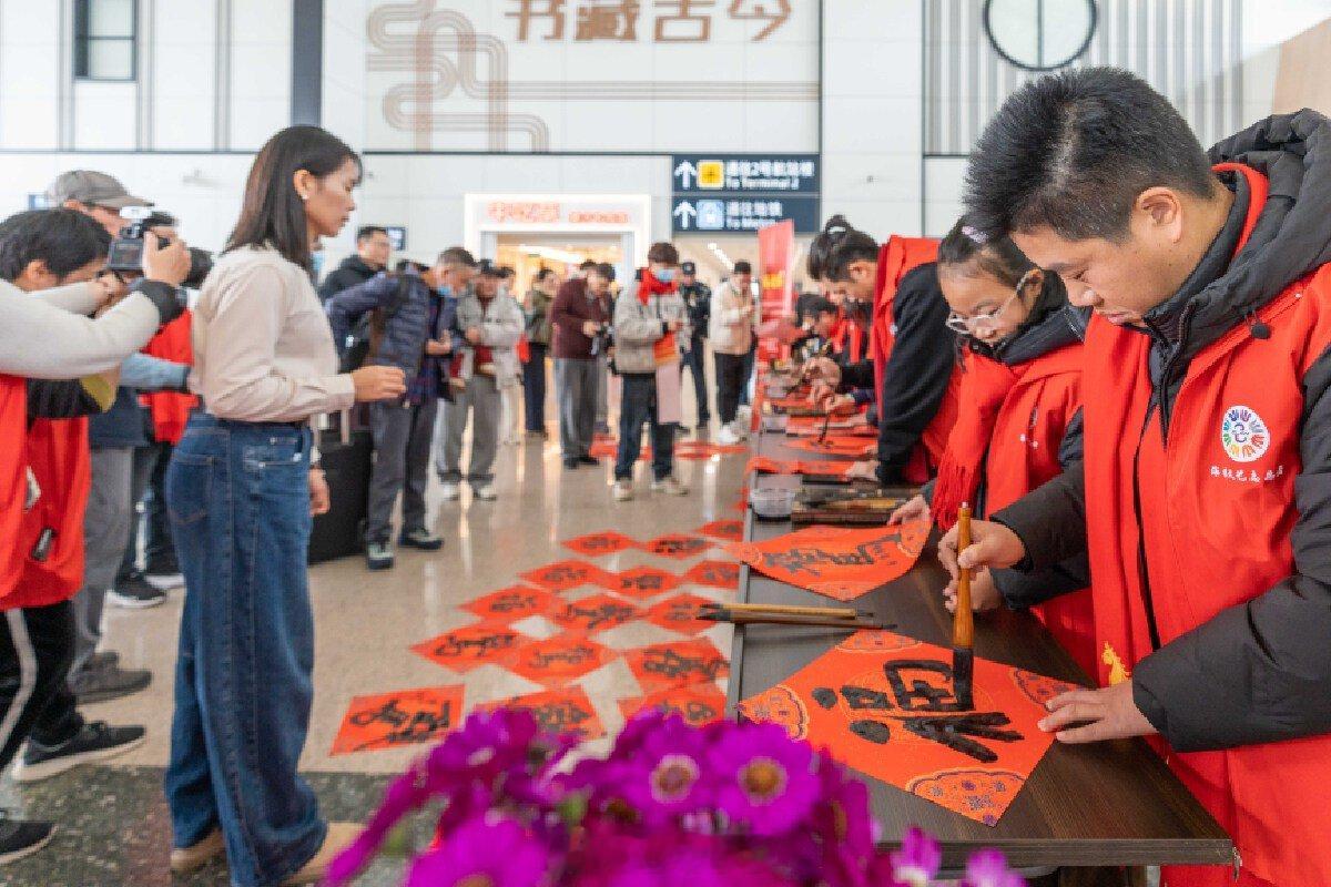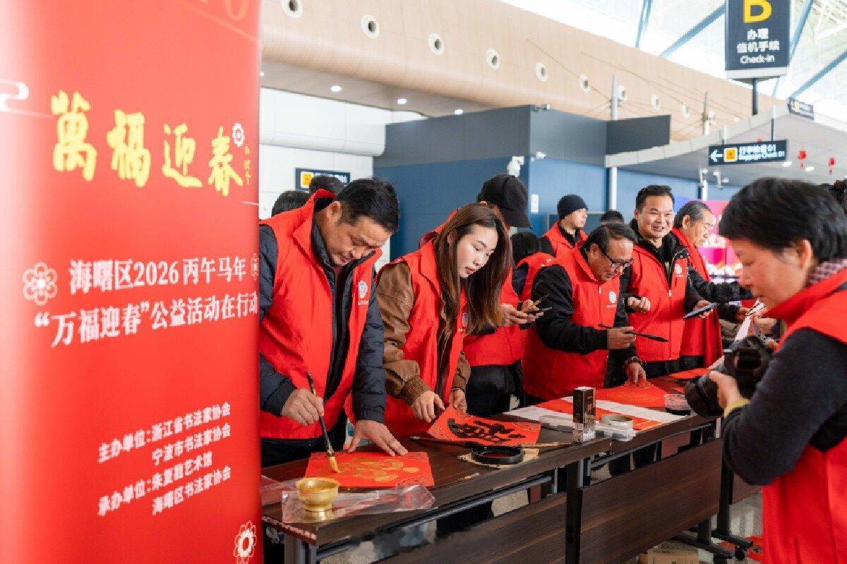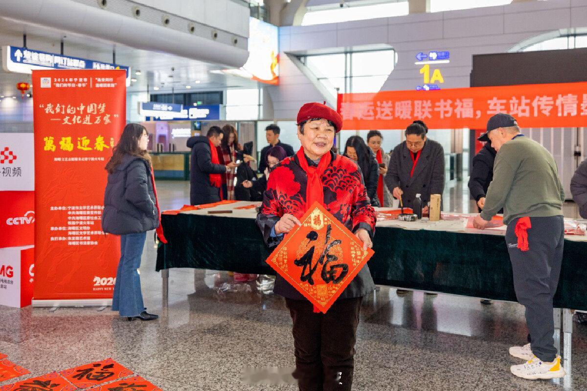宁波海曙的墨香祝福连续9年温暖了春运路 近日,宁波海曙,海曙文艺志愿者奔赴铁路宁波站、宁波栎社国际机场,为往来旅客挥毫泼墨,送上一副副春联、一个个福字,把新春的美好祝福传递到旅客手中。