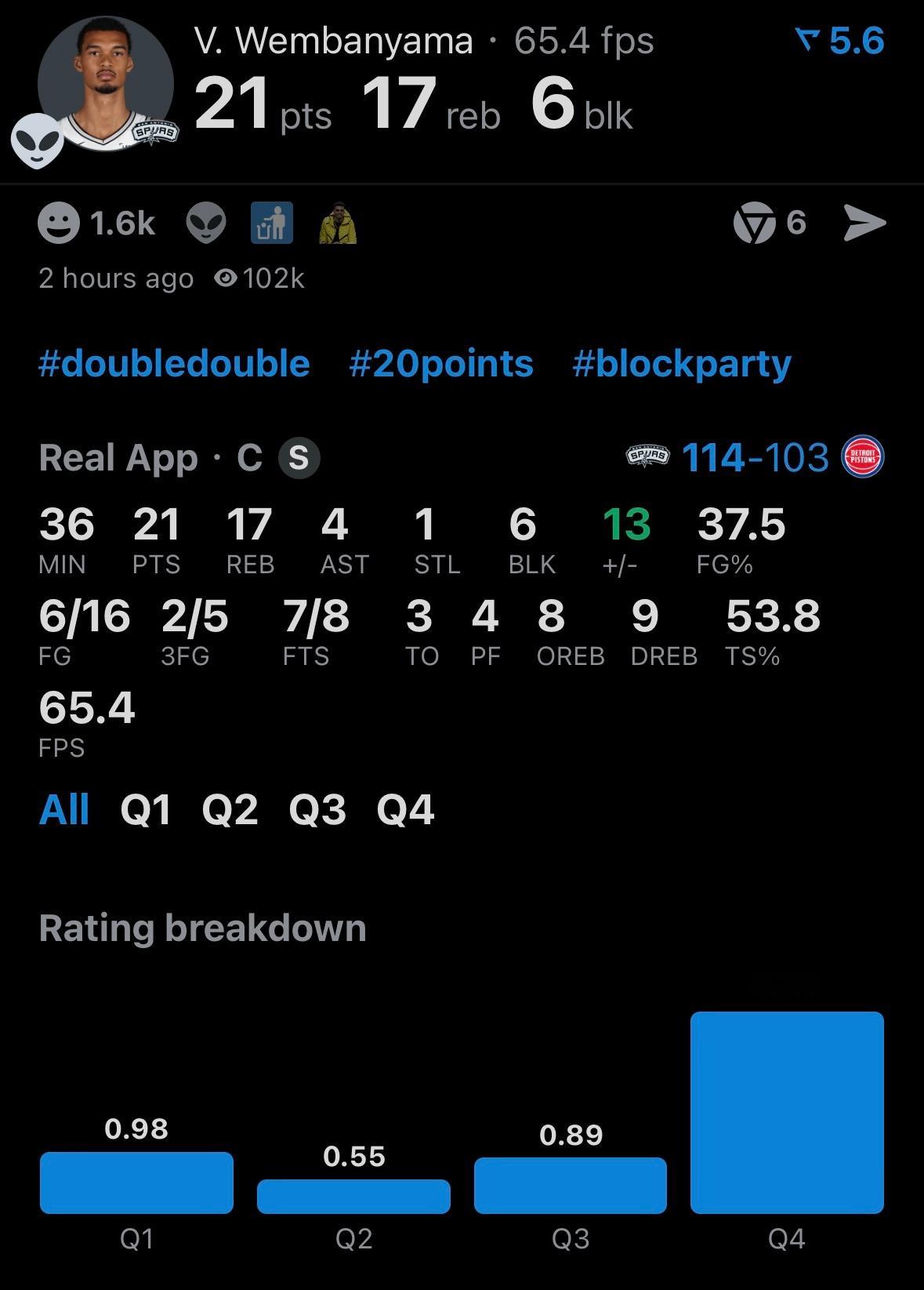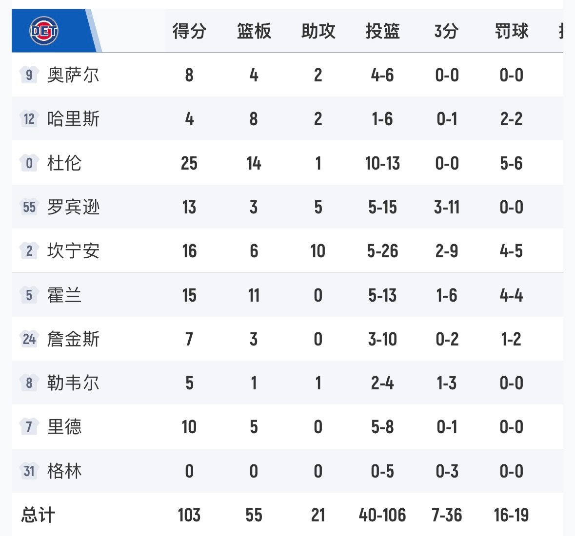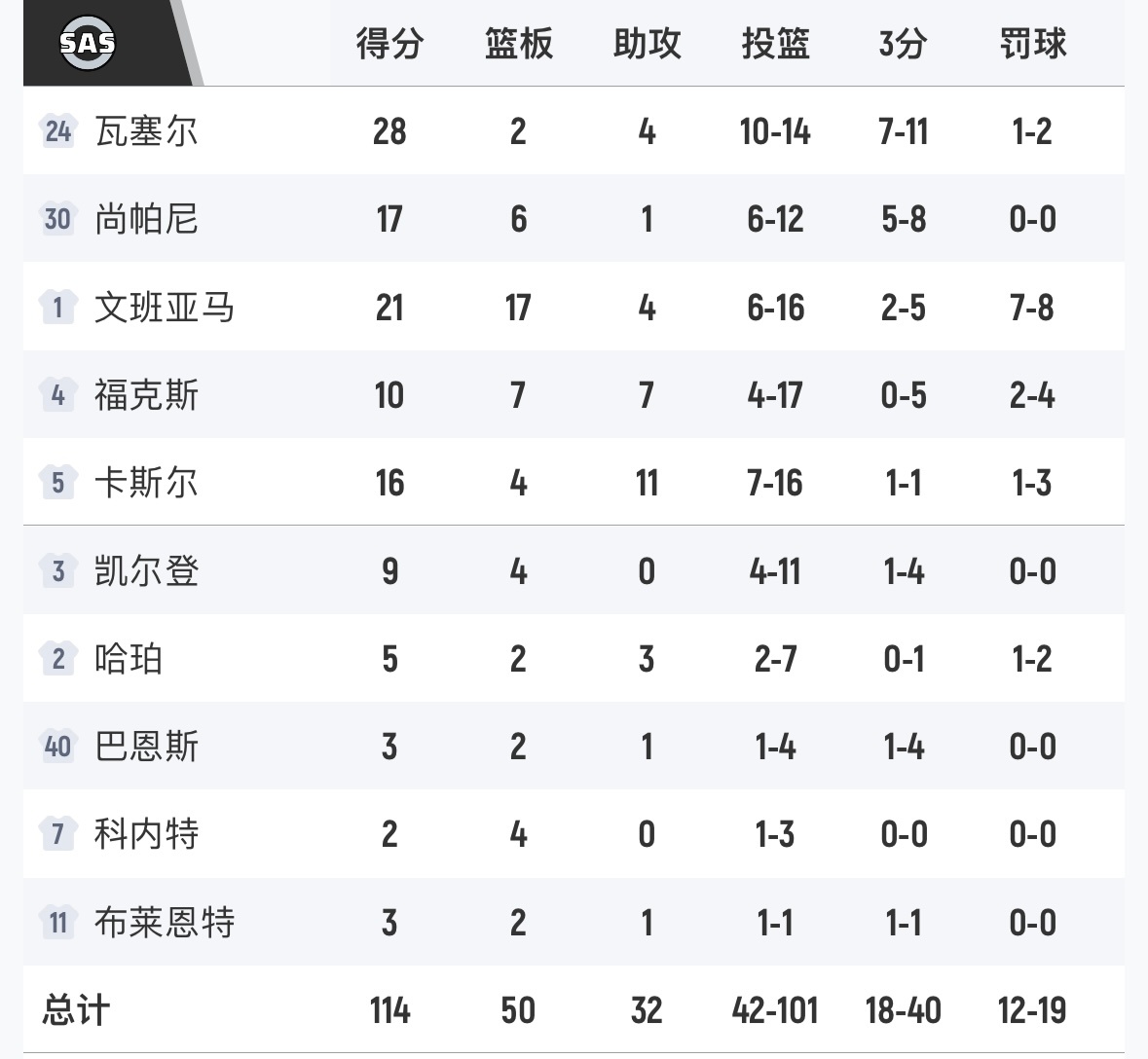 马刺114-103战胜活塞,获得9连胜,活塞三分球36投仅7中。 文班亚玛21分17板6盖帽,坎宁安16分6板10助攻,26投5中,三分9中2。 马刺vs活塞
