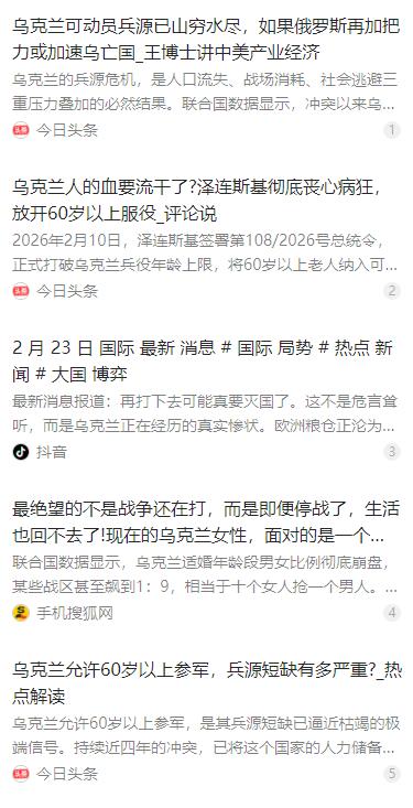 乌克兰还有一个大问题很多人都没注意到,那就是乌克兰的女人将来该怎么办?战争把男人都卷走了,家里只剩女人和小孩,想找个靠谱男人比登天还难。 麻烦看官老爷们右上角点击一下“关注”,既方便您进行讨论和分享,又能给您带来不一样的参与感,感谢您的支持! 很多人只看到俄乌冲突的战场胜负,却忽略了一个更隐蔽、更长远的危机,那就是乌克兰女性正在独自承受战争带来的全部代价。 2022 年俄乌冲突全面爆发后,乌克兰人口结构迅速崩塌。乌克兰国家科学院人口研究所数据显示,全国人口从战前约 4200 万锐减至不足 3600 万,减少规模超数百万。 青壮年男性成为冲突中流失最严重的群体,大量人员在战场伤亡、出境避难或被持续动员,国内劳动力与家庭支柱出现巨大缺口,社会结构被强行改写。 在男性大量缺席的情况下,乌克兰各地女性被迫扛起养家、育儿、维持生产的三重责任,从家庭主妇变成社区、工厂、农田里的主力,独自支撑着破碎的社会运转。 冲突带来的伤害远不止生活压力。联合国人权高专办监测数据显示,截至 2024 年底,已有数千名乌克兰女性与女童在战火中丧生,数万人受伤,大量女性承受长期身心创伤。 她们不仅要面对随时可能到来的危险,还要处理亲人阵亡、失联、流离失所带来的打击,很多人在焦虑与恐惧中勉强维持日常,心理创伤难以在短期内修复。 比当下困境更棘手的是未来。持续的人口流失与战场消耗,让乌克兰适婚男女比例严重失衡,适龄男性数量大幅减少,大量女性面临婚恋困难。 正常的家庭组建受阻,直接导致生育率持续走低,原本就脆弱的人口结构陷入恶性循环,这种失衡一旦形成,即便冲突结束,也需要数十年才能缓慢修复。 目前国际社会对乌克兰的援助,大多集中在武器、物资、基础设施重建等领域,针对女性身心保护、家庭支持、就业与婚恋保障的长期投入明显不足。 这种忽视让女性困境被边缘化,而人口修复与社会创伤愈合,恰恰是决定乌克兰未来几十年能否稳定复苏的关键,比短期物资补给影响更深远。 这场漫长冲突带走的不只是生命与财富,还有一个国家正常的人口结构与家庭生态。当男性大量缺席,女性被迫撑起一切,乌克兰的未来也被绑在这场看不到尽头的消耗里。 比起战场的输赢,如何安置这些撑起国家的女性,如何修复断裂的人口链条,才是乌克兰更难解决、也更该被看见的真问题。